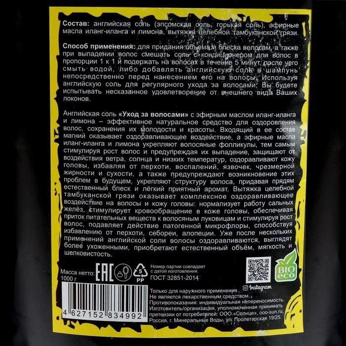 Английская соль Бизорюк «Уход за волосами» с эфирными маслами иланг-иланга и лимона, 1 кг. 445901