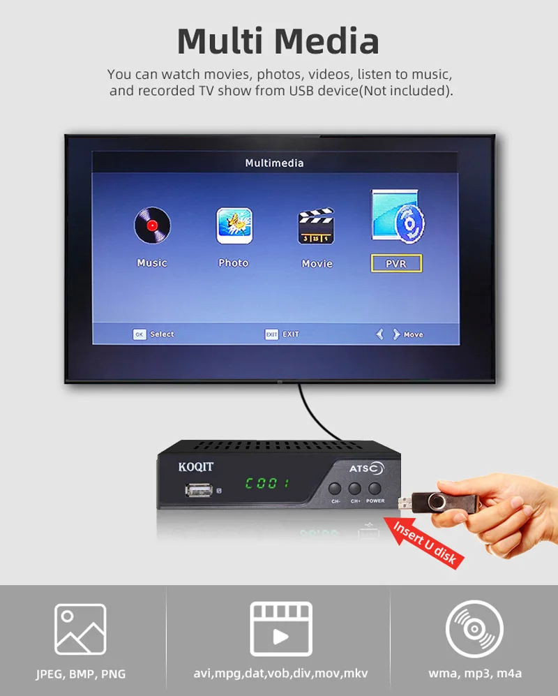 Koqit ATSC цифровое ТВ конвертер преобразует по воздуху ATSC цифровое тв вещания для того, чтобы ваш аналоговый и цифровой телевизор, проектор, и монитора компьютера. Поддерживает до 1080P