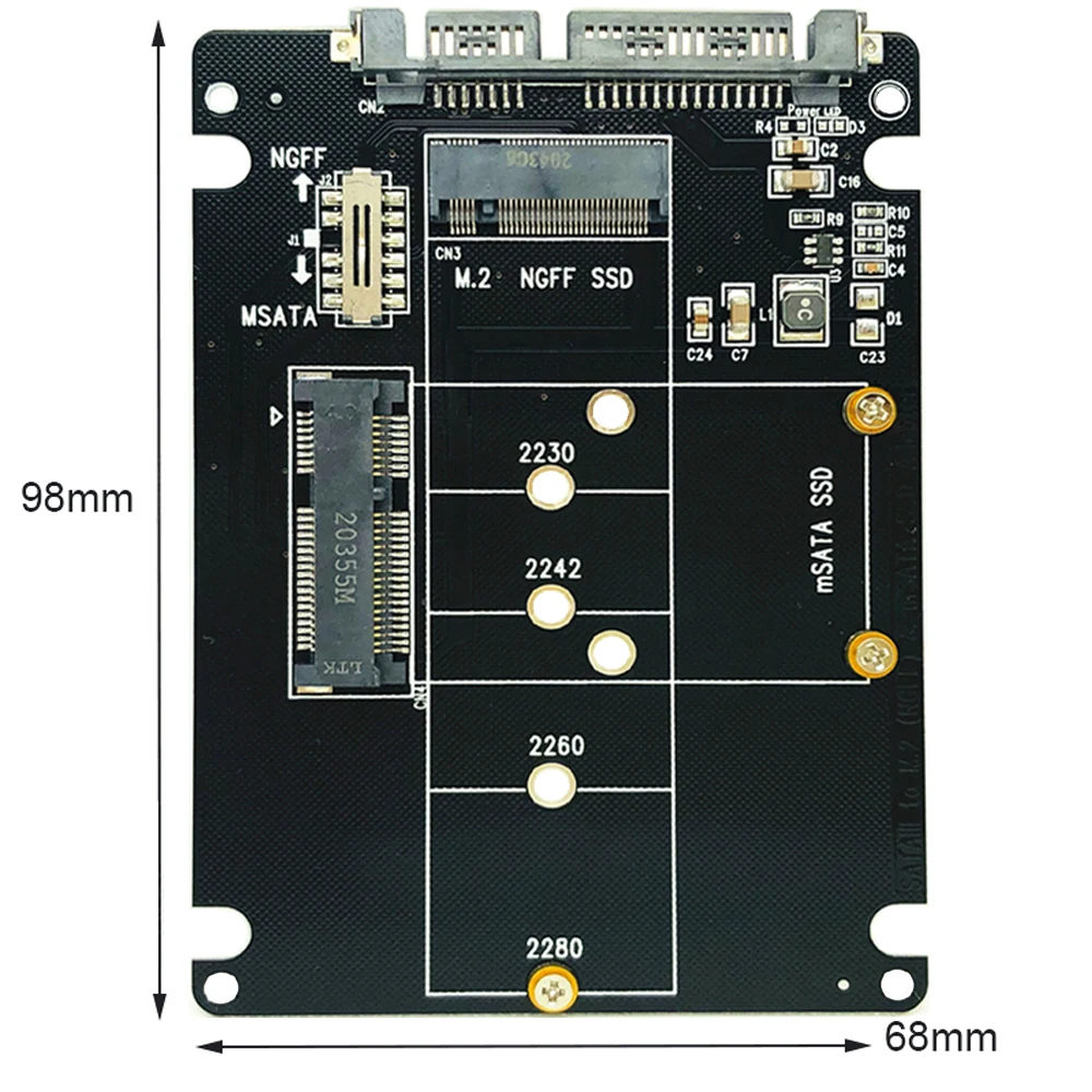 Новый комбинированный преобразователь 2-1-новейший универсальный адаптер M.2 и mSATA SSD на SATA. Используйте его, чтобы легко подключить любой из 4 различных размеров M.2 NGFF SSD или полный mSATA SSD к SATA порту. Его можно использовать в качестве загрузочного диска и не требует дополнительных драйверов. Он подходит как для систем Windows, так и для Mac OS. Данная карта не имеет чипа и служит только эффектом передачи данных. Скорость связана с самим SSD. Конструкция переключателя, вы можете легко настроить переключатель в установленный режим SSD.