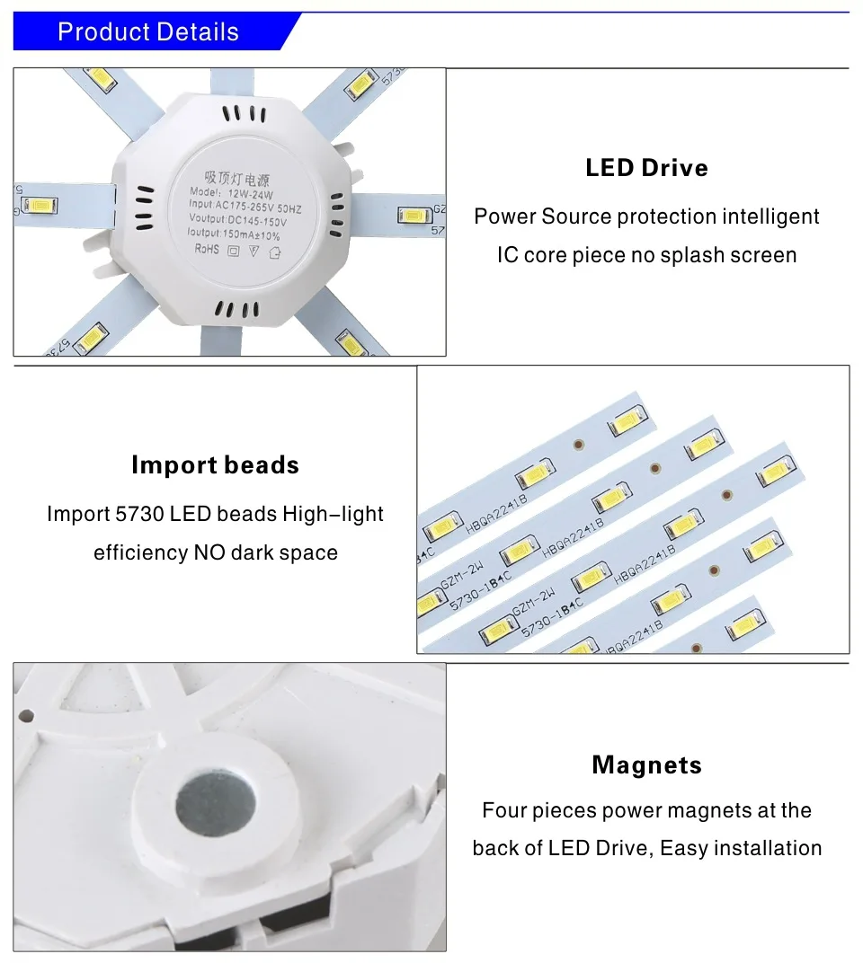 Дизайн: драйвер на плате, линейный вход переменного тока напрямую, нет необходимости в массовом источнике питания. Сохраните свои существующие декоративные светильники и обновите светодиодный светильник. Энергосбережение: 90% энергосбережение, резко снижает затраты на электроэнергию. Применяется к потолочный светильник, потолочный вентилятор светильник, кулон, светильник-фонарик и другие приспособления может поместиться в модифицированный модуль. High End светильник: 160 градусов широкоугольный объектив с фокусным расстоянием формирует светильник распределения, создает еще светильник выход без светильник пятна, CRI90 и высокая яркость создают vivid и чистой среде. До 5% традиционных возможностей затемнения без мерцания. Длительный срок службы: 50000 часов срока службы, самое низкое обслуживание. Простая установка: полный набор аксессуаров приносит удовольствие от DIY, не нужно раздражать дрель, может быть установлен с центральным резьбовым винтовым типом приспособлений или непосредственно на плоских основаниях приспособлений с магнитной ножкой.