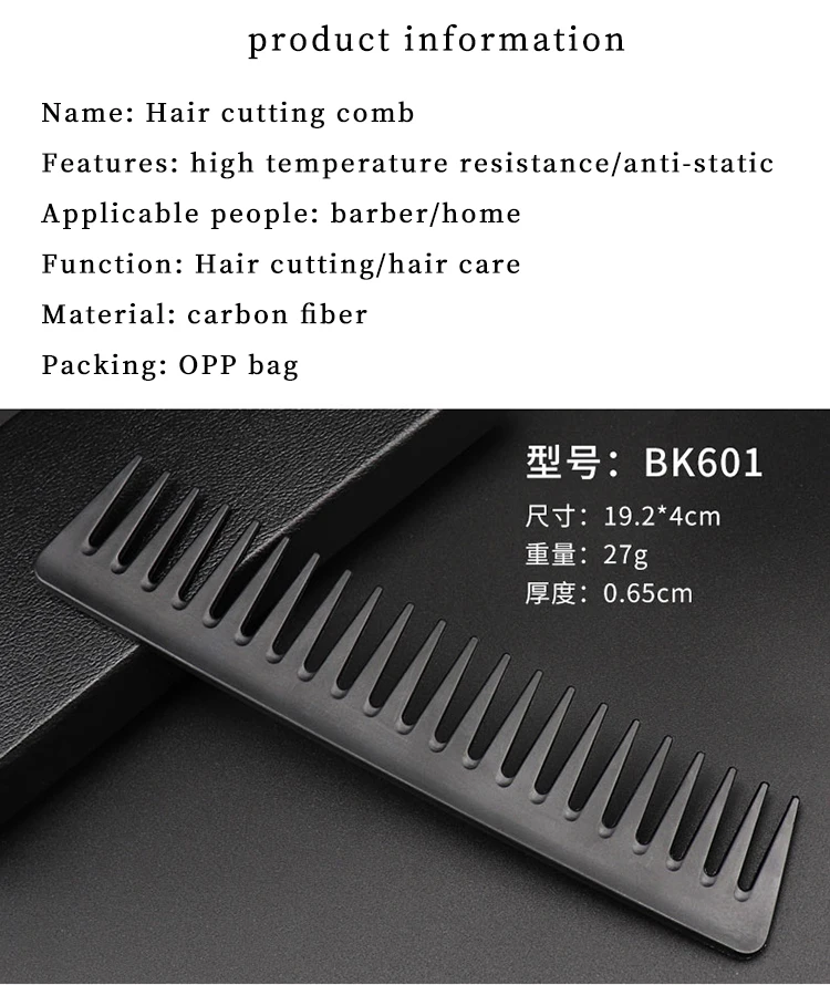 Наименование: расческа для стрижки волос Особенности: высокая термостойкость/Антистатический Подходит для: парикмахера/дома Функция: стрижка волос/Уход за волосами Материал: углеродное волокно Упаковка: полипропиленовый пакет