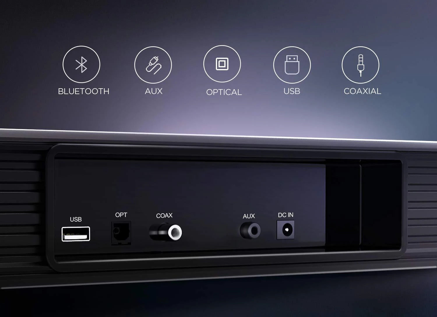 Включает оптический, Aux, коаксиальный, USB, совместим с 4k & HD TV, проектор, ПК, планшет, XBOX, PS4 и т. Д. Коаксиальные соединения дают лучший звук, включают pcm под настройками для четких, громких, глубоких басов.
