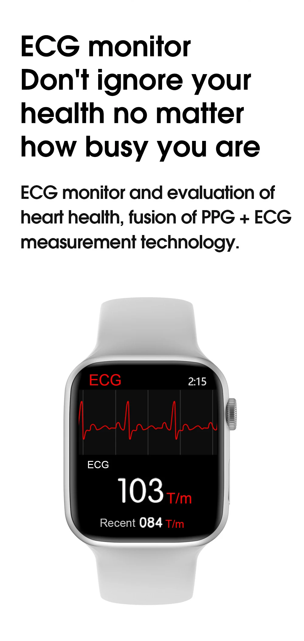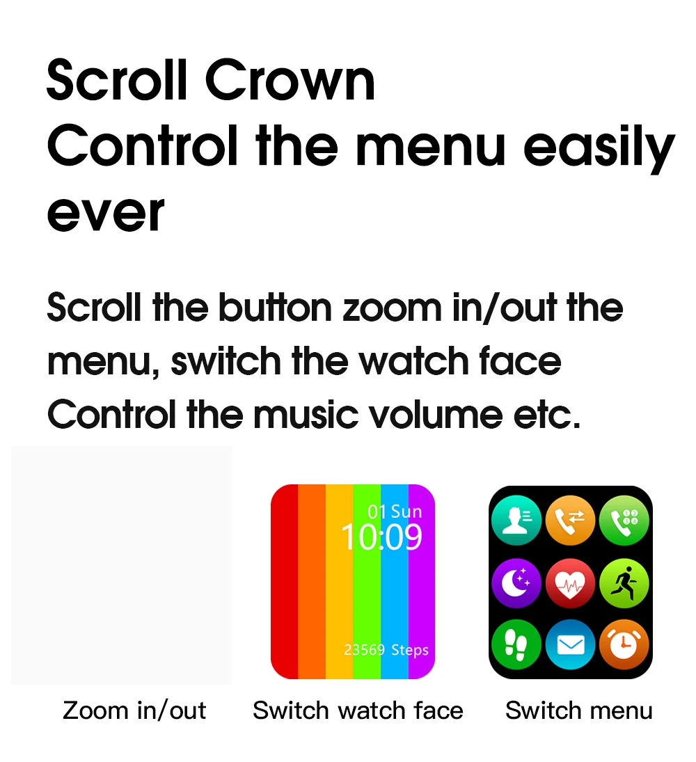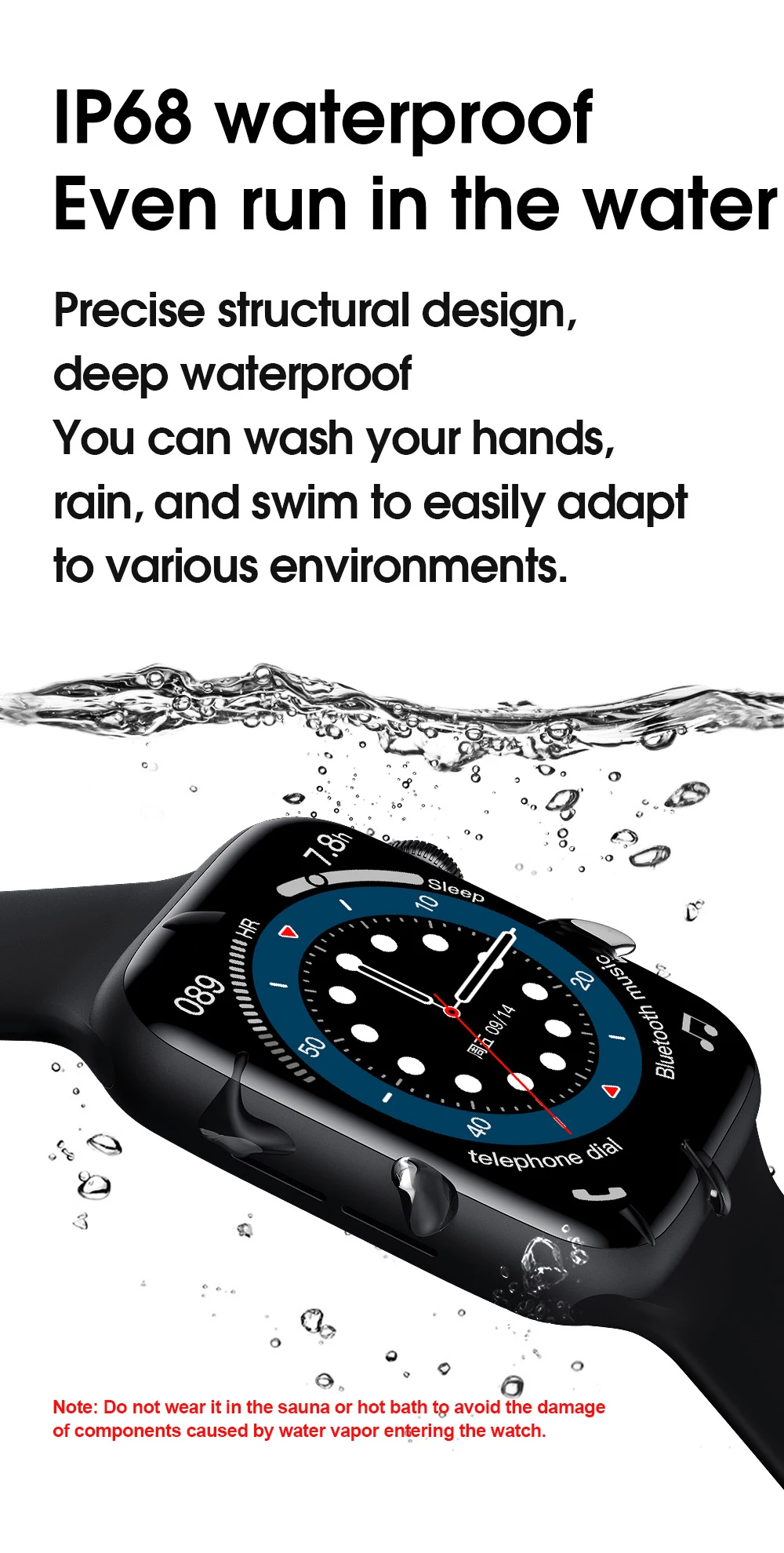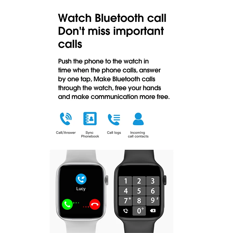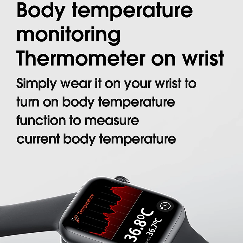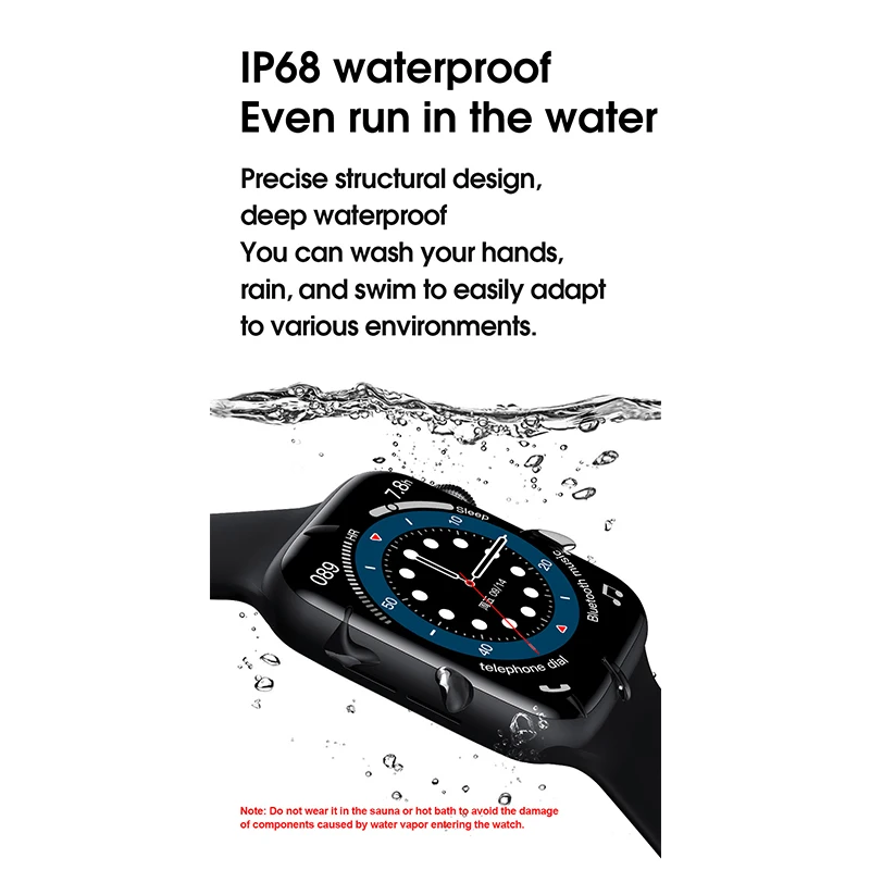 Bluetooth Вызов, пользовательские часы лица, температура тела, частота сердечных сокращений, BP & ECG, шаг, 44 мм сменный ремешок, умное сотовое меню, меню 9 приложений, IP68 водонепроницаемый, кнопка вращения, беспроводное зарядное устройство, приложение для часов