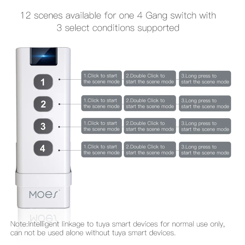 2. Три режима сопряжения для каждой кнопки для достижения 12 сцен с одного 4 пульта дистанционного управления, таких как режим вдали, домашний режим, режим кино в каждой кнопке и т. Д. Для создания любой умной автоматизации, как вы Хотите, чтобы в вашем смартфоне был запущен другой Интеллектуальный образ жизни, больше нет голосовой команды, больше нет времени, чтобы открыть приложение, требуется только одно касание, когда вы устали от одного дня Работа.
