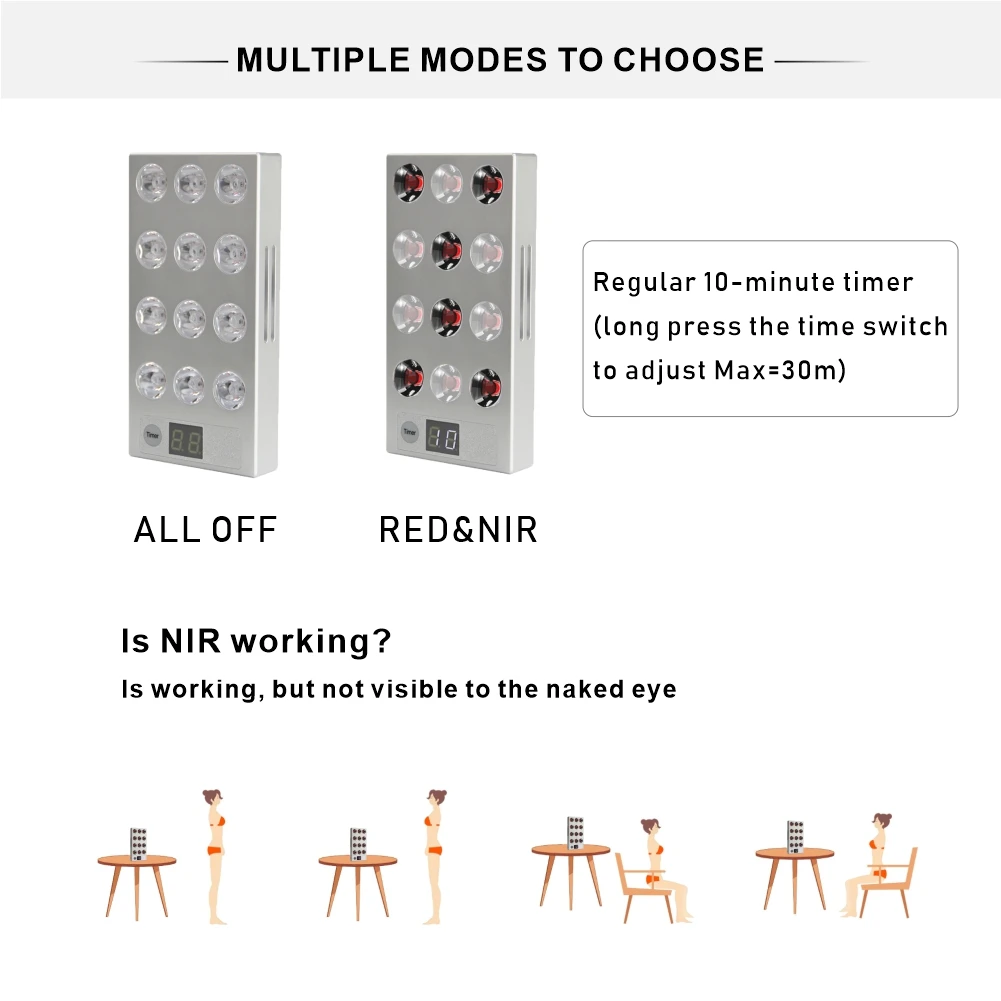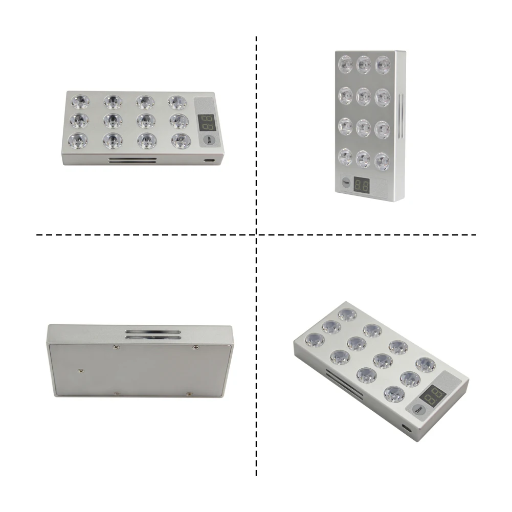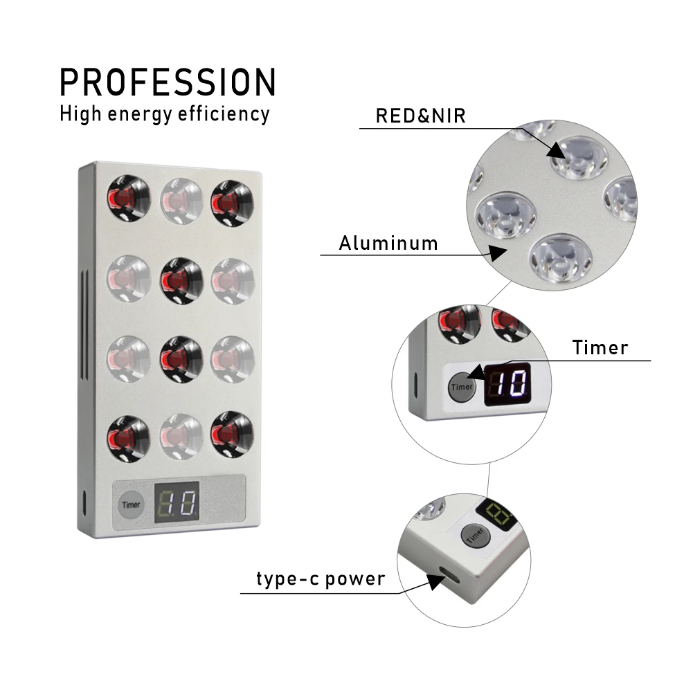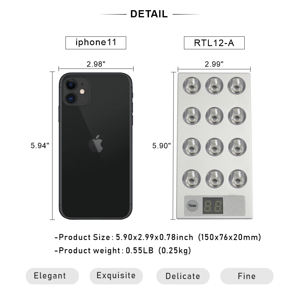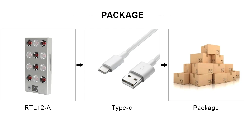 RTL12-A 1) 12 шт. 3 Вт светодиодный чип 2) Входное напряжение: 100-240 В переменного тока 3) Частота: 50/60 Гц 4) Объектив: 30 ° 60 ° 5) светильник denisty: >60 мВт/см2 6) Размер: 150*76*20 мм 7) спектр: 850:660 или на заказ 8) Цифровая вставка таймера, исправление 10 минут 9) посылка включает в себя: 1 шт. светильник + 1 шт. 1,5 м USB кабель 10) Вес брутто: 0,5 кг/шт.