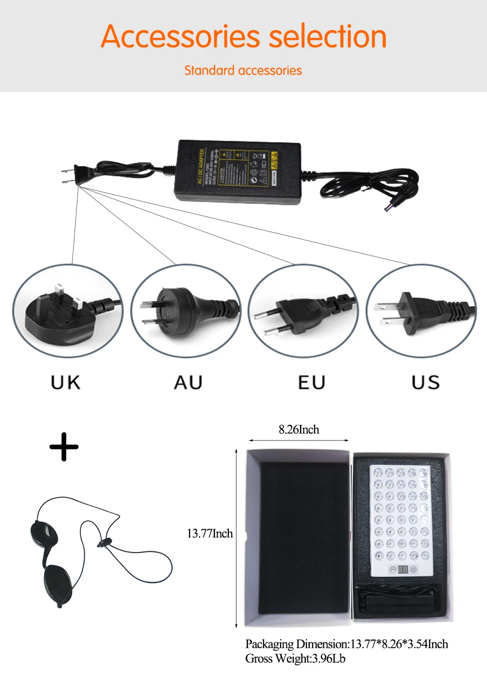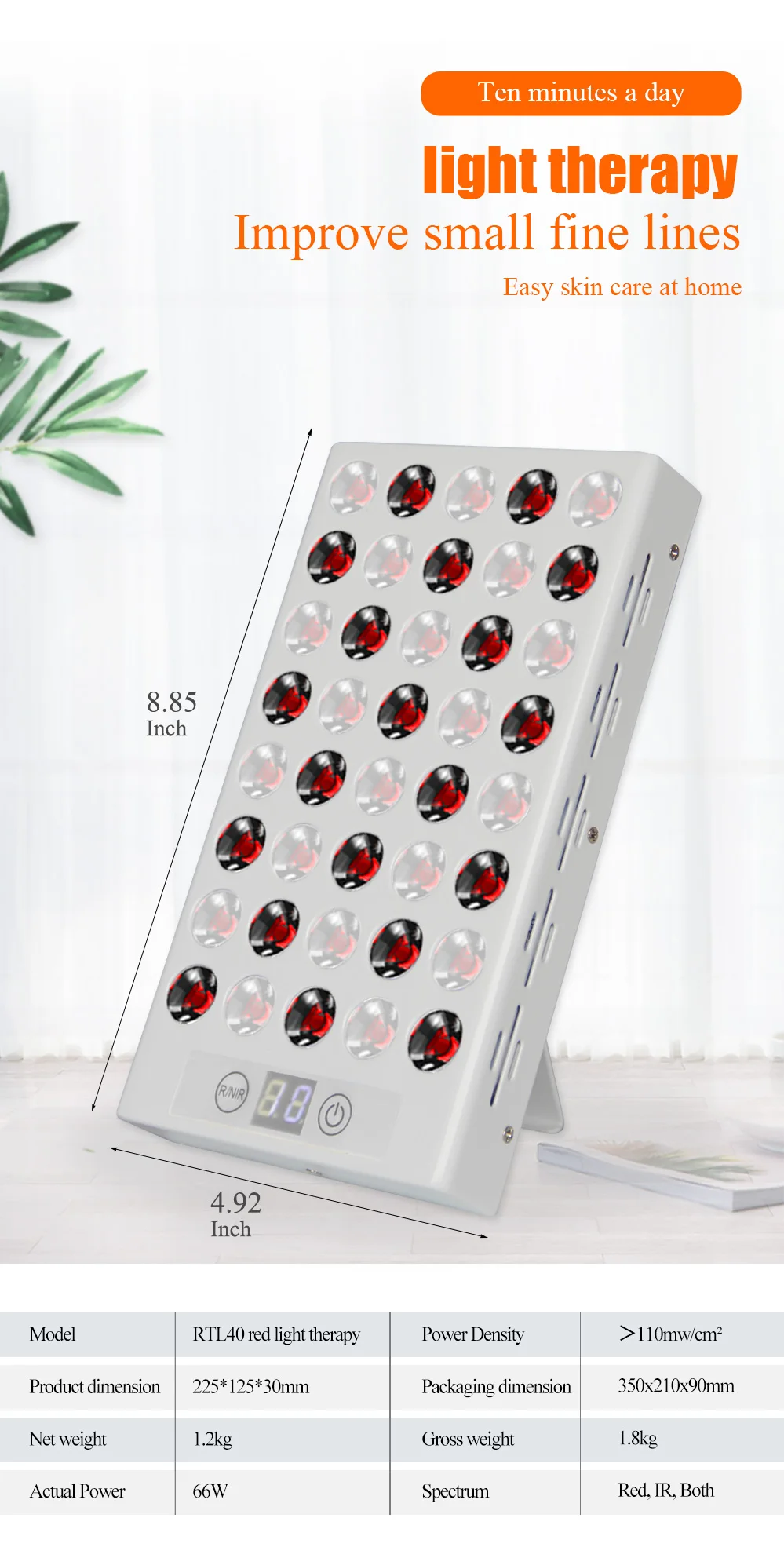 TL40 1)40 шт. 5 Вт светодиодный чип 2) Входное напряжение: 100-240 В переменного тока 3) Частота: 50/60 Гц 4) Объектив: 30 ° 60 ° 5) светильник denisty: >100 мВт/см2 6) Размер: 225*125*36 мм 7) спектр: 850:660 или на заказ 8) Цифровая вставка таймера, исправление 10 минут 9) посылка включает в себя: светильник 1 шт. + драйвер 1 шт. с вилкой + маска для глаз 1 шт. 10) Вес брутто: 0,8 кг/шт.