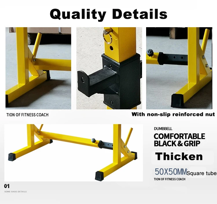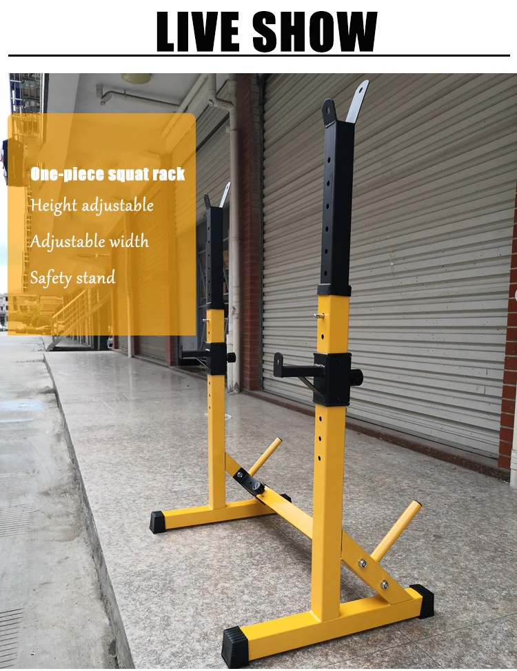 Название продукта: цельная регулируемая стойка для приседания Размер изделия: 85,0 см * 56,0 см * 12,0 см Вес изделия: 13 кг 10 уровней регулировки высоты, диапазон регулировки составляет около 81-131 см Ширина 9 уровнями регулировки, наружный Ширина диапазон регулировки составляет около 72-112 см, подходит для 1,5-1,8 метров штанга гантельного типа Защитный кронштейн можно отрегулировать до 46,5 см от земли, что подходит для выполнения некоторых упражнений на скамейке с помощью скамейки. В тех случаях, когда вверх корректирующий, каждая Шестерня составляет около 4,5 см выше!