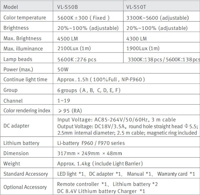 Viltrox VLS-50T использует высококачественные SMD светодиодный лампы, которые отличаются более низким энергопотреблением, более широким диапазоном облучения и мягкий светильник. С металлическим корпусом, он имеет хорошую теплоотдачу. Яркость может быть легко отрегулирована в соответствии с вашими требованиями. Светильник подходит для заполнения различных сцен, таких как microshot, свадебное видео, интервью, Фотографии товаров и т. д.