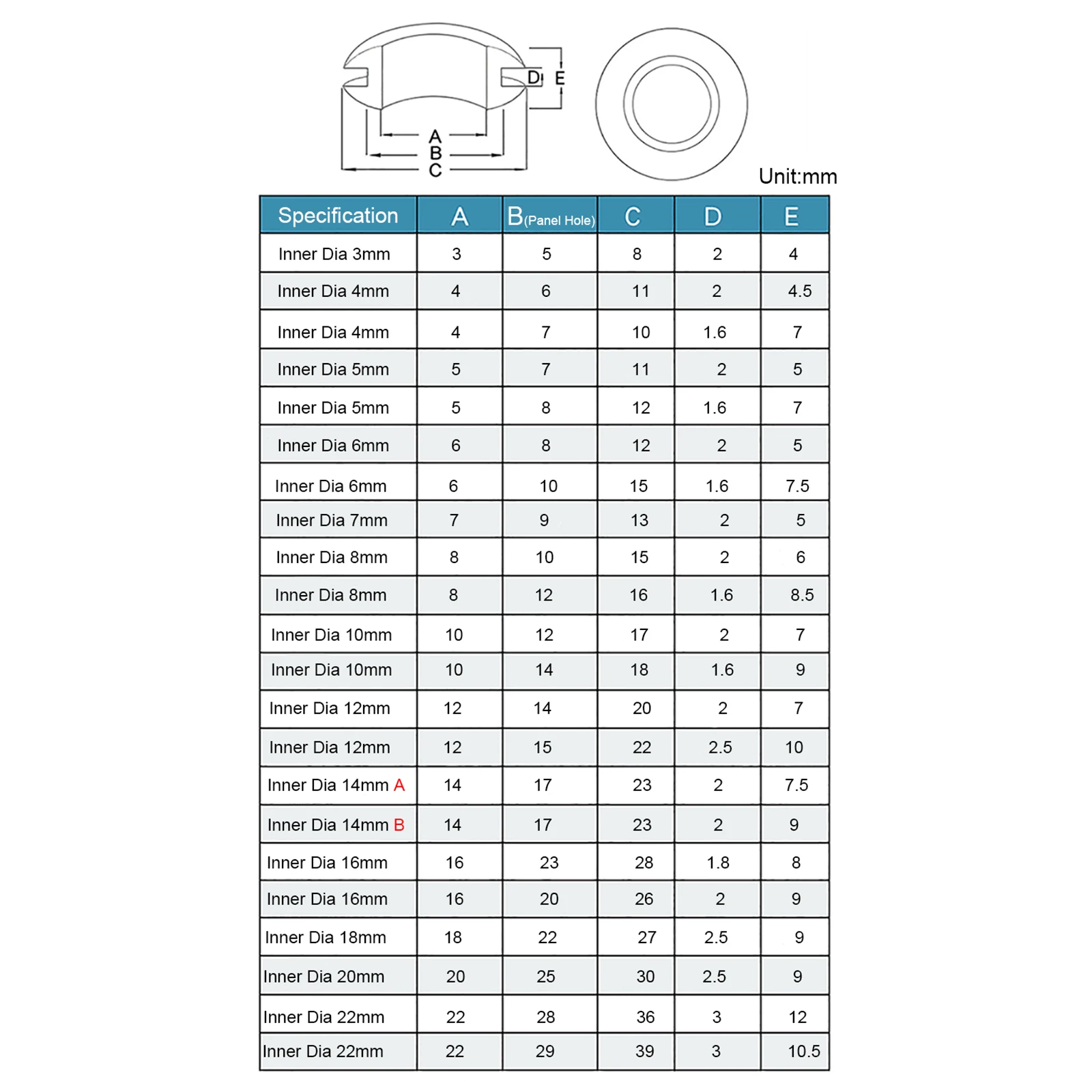 -Размер (внутренний диаметр х пластинчатое отверстие) : 3 мм х 5 мм, 4 мм х 6 мм, 4 мм х 7 мм, 5 мм х 7 мм, 5 мм х 8 мм, 6 мм x 8 мм, 6 мм x 10 мм, 7 мм x 9 мм, 8 мм x 10 мм, 8 мм x 12 мм, 9 мм x 15 мм, 10 мм x 12 мм, 10 мм x 14 мм, 12 мм x 14 мм, 12 мм x 15 мм, 14 мм x 17 мм (A), 14 мм x 17 мм (B), 16 мм x 20 мм, 16 мм x 23 мм, 18 мм x 22 мм, 20 мм x 25 мм, 22 мм x 28 мм, 22 мм x 29 мм, 25 мм x 30 мм