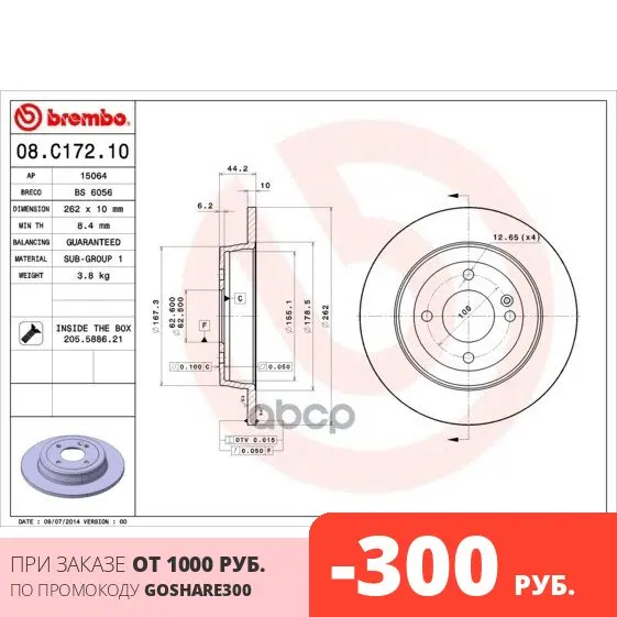 Отзывы о Disc brake rear 262mm Brembo art. 08.C172.10 wait stand contact block shoe holding parking system stop handbrake surface hold | Автомобили