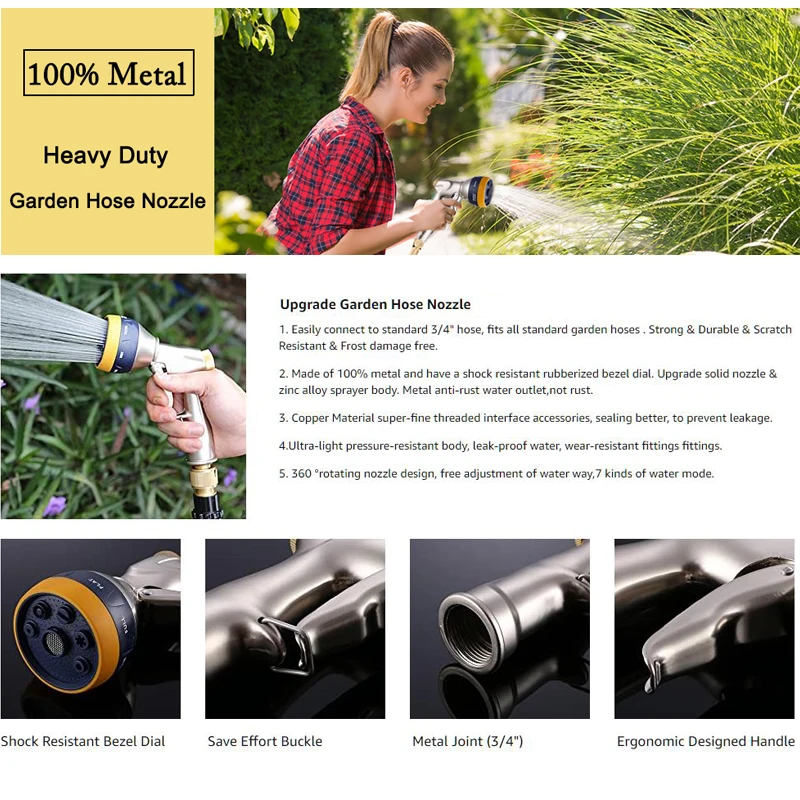 Детали: Модернизированное сопло для водопроводной трубы-100 металл. Шланговое сопло представляет собой нагрузку с избыточным весом, изготовленную из корпуса из цинкового сплава и триггера. Высокое качество, предотвращающее протекание, ржавчину, коррозию и истирание, более прочное, чем пластик. Ударопрочный резиновый циферблат предотвращает случайное падение распылителя. Подходит для всех стандартных садовых шлангов и герметичных-подходит для всех садовых шлангов на основе Соединенных Штатов-3/4 дюймовый для садового шланга резьба (длина). Адаптер не нужен! Цельная конструкция и несколько внутренних резиновых уплотнительных колец обеспечивают долговечное плотное уплотнение для предотвращения утечки. 7 режимов распыления для всех целей-модернизированная форсунка распылителя обеспечивает 7 различных режимов распыления для легкого использования. При необходимости легко переключается между настройками «по центру», «плоский», «конус», «угол», «душ», «распыление» и «распыление». Отлично подходит для полива сада, газона, кустов и цветочных клумбов. Также подходит для автомоек, собак и домашних животных. Экономичная конструкция-наш Насадка На садовый шланг оснащен красивым стопорным рычагом в нижней части ручки, благодаря чему вода не накапливается без давления. Зажим для рук может облегчить проблемы длительного использования.