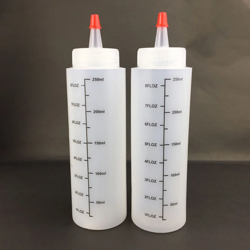 Эта измерительная бутылка для соуса имеет четкие весы объема на поверхности, которая использует два блока, и весы долговечны и не легко носить.