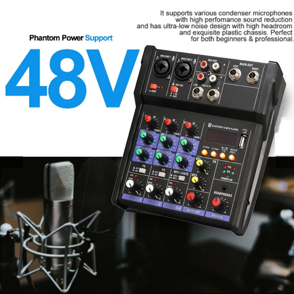 Отзывы о Аудио микшер UHF микрофон Bluetooth аудио USB DJ звуковая микшерная консоль 4 канала 48 В