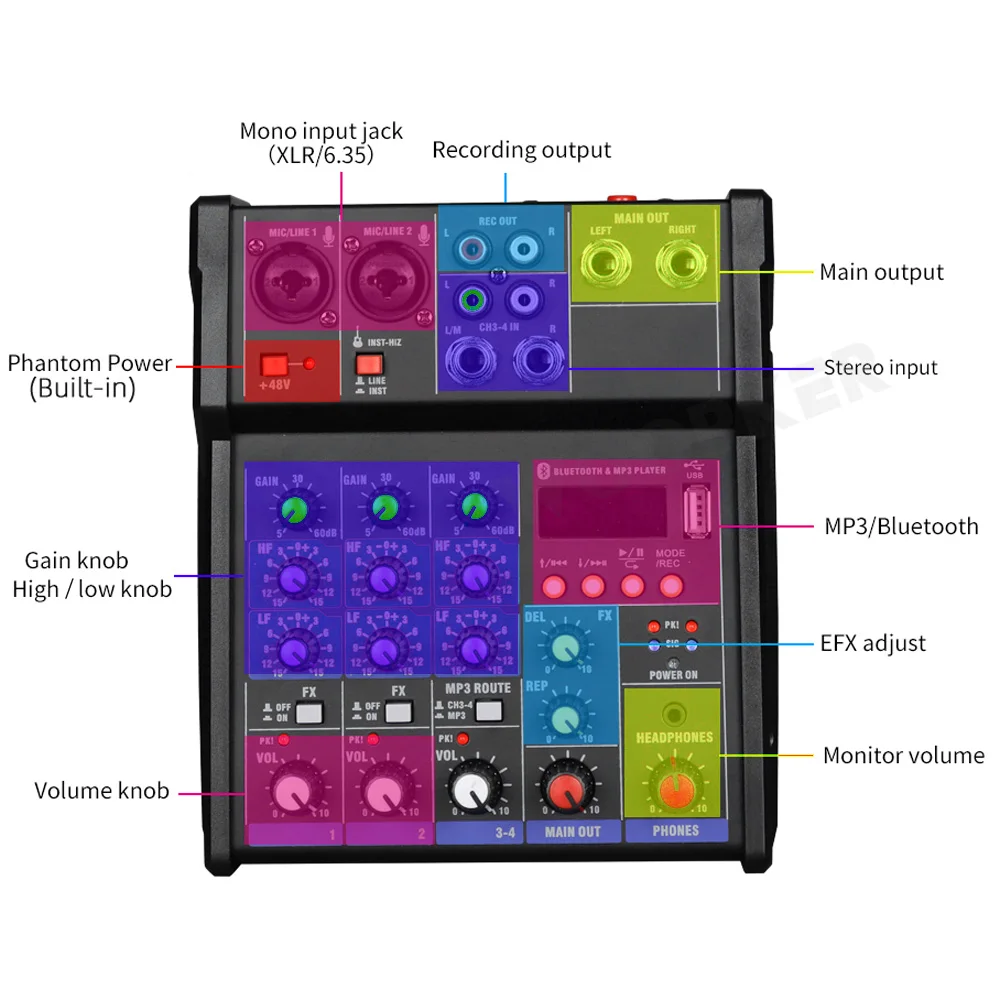 Идеальная возможность настройки Регулировка: усиление; Средний/Высокий/бас; Реверберация; Громкость 2-канальный однотонные микрофон/линейный входной канал, 1 группы стереофонический вход переменного тока, с сбалансированным время XLR Сделано в Китае тип микрофон входное гнездо,-это высококачественный усилитель микрофона. Возможность настройки завершена, с функцией регулировки громкости, басов, реверберации и громкости. 1 группа входов основного канала, 1 группа выходов дополнительного канала и обратного интерфейса. 1-канальный независимой записи Выход и порт прослушивания. Встроенная функция Bluetooth, поддерживает большую часть функции Bluetooth беспроводного подключения к электронному оборудованию, быстрая док-станция. Поддержка мобильного устройства хранения U диск, вы можете хранить песни в U диск, вставить воспроизведение. Интеллектуальная Совместимость с различными устройствами: беспроводной микрофон, усилитель мощности, мобильный телефон, компьютер, электронный инструмент, проводной микрофон, аудио Кнопка типа потенциометра, поверхность вогнутая и выпуклая противоскользящая конструкция, лучшая ручка, более точная регулировка. Можно подключить проводной/беспроводной/конденсаторный микрофон, подходит для семьи KTV, настройки, сетевого хоста, радиовещания, звукозаписи и т. Д. Встроенный эффект реверберации, регулируя ручку для регулировки глубины реверберации и эффекта задержки. Функция звуковой карты, имеет функцию обработки компьютерной вокальной музыки. Вы можете вызвать профессиональное аудио. Несколько аудиокабелей. 6,35 Цветочные соединения, тонкая работа и стабильная передача. Простой дизайн, легкий и удобный, ударопрочный металлический корпус с порошковым распылением, более устойчивый к падению, низкий уровень шума, более прочный 4 канала Вход:
