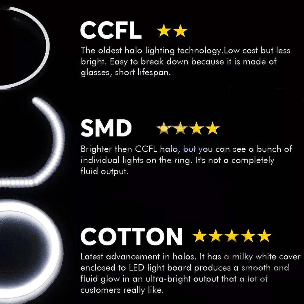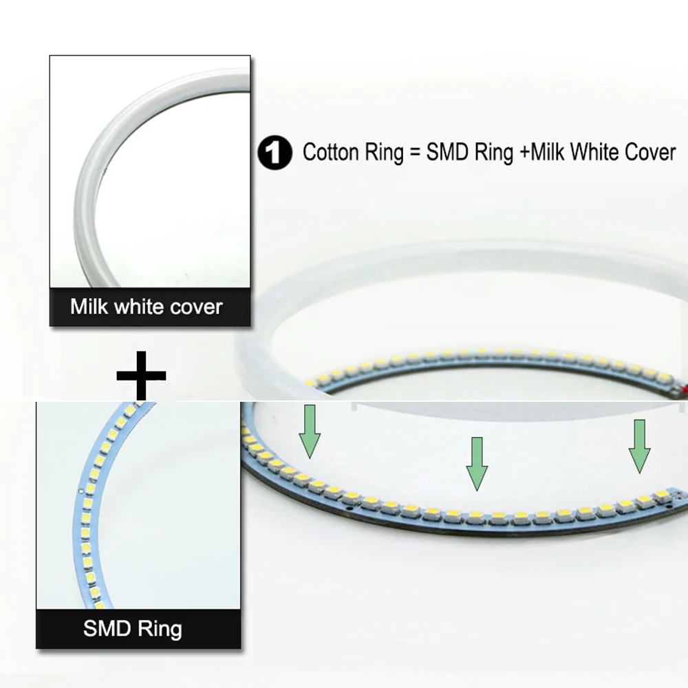 1. Специальный светильник из хлопка с SMD светодиодный ангельские глазки, который примерно в 2-3 раза ярче, чем обычные Кольца CCFL ангельские глазки, без слепых точек по сравнению с Кольца CCFL.