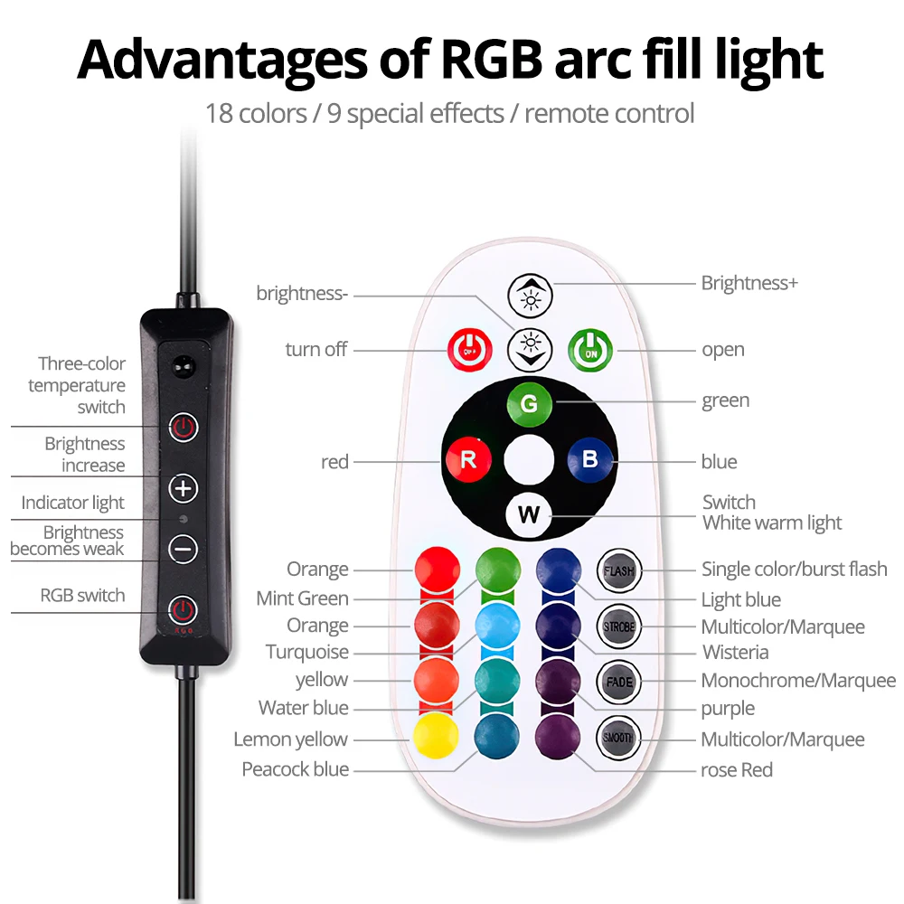 3. 26-RGB режим освещения Регулируемая яркость на ваш выбор, вы можете настроить цвет и яркость очень легко, идеальная яркость может быть достигнута без установки дополнительных красочных фильтров. Различные цвета натурального мягкого Светильник Освещает вашу красоту в различных случаях.
