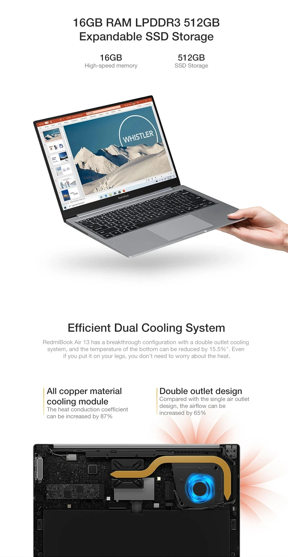RedmiBook Air 13 оснащен одним вентилятором и двойной системой охлаждения на выходе. Температура нижней поверхности фюзеляжа уменьшается на 15.5%, что позволяет сохранять прохладу в любое время. Даже если он расположен на ноге, нет необходимости беспокоиться о производстве тепла.