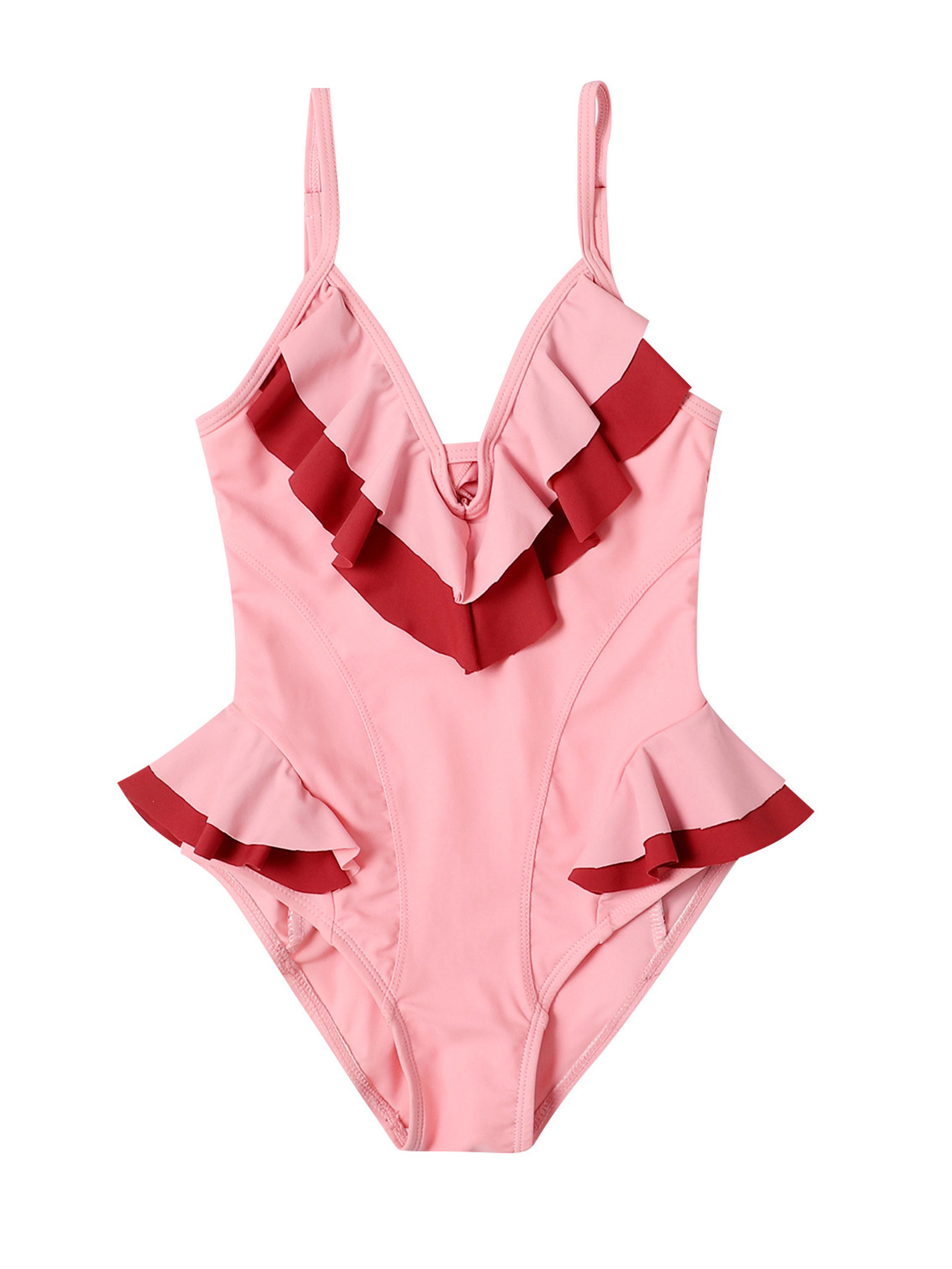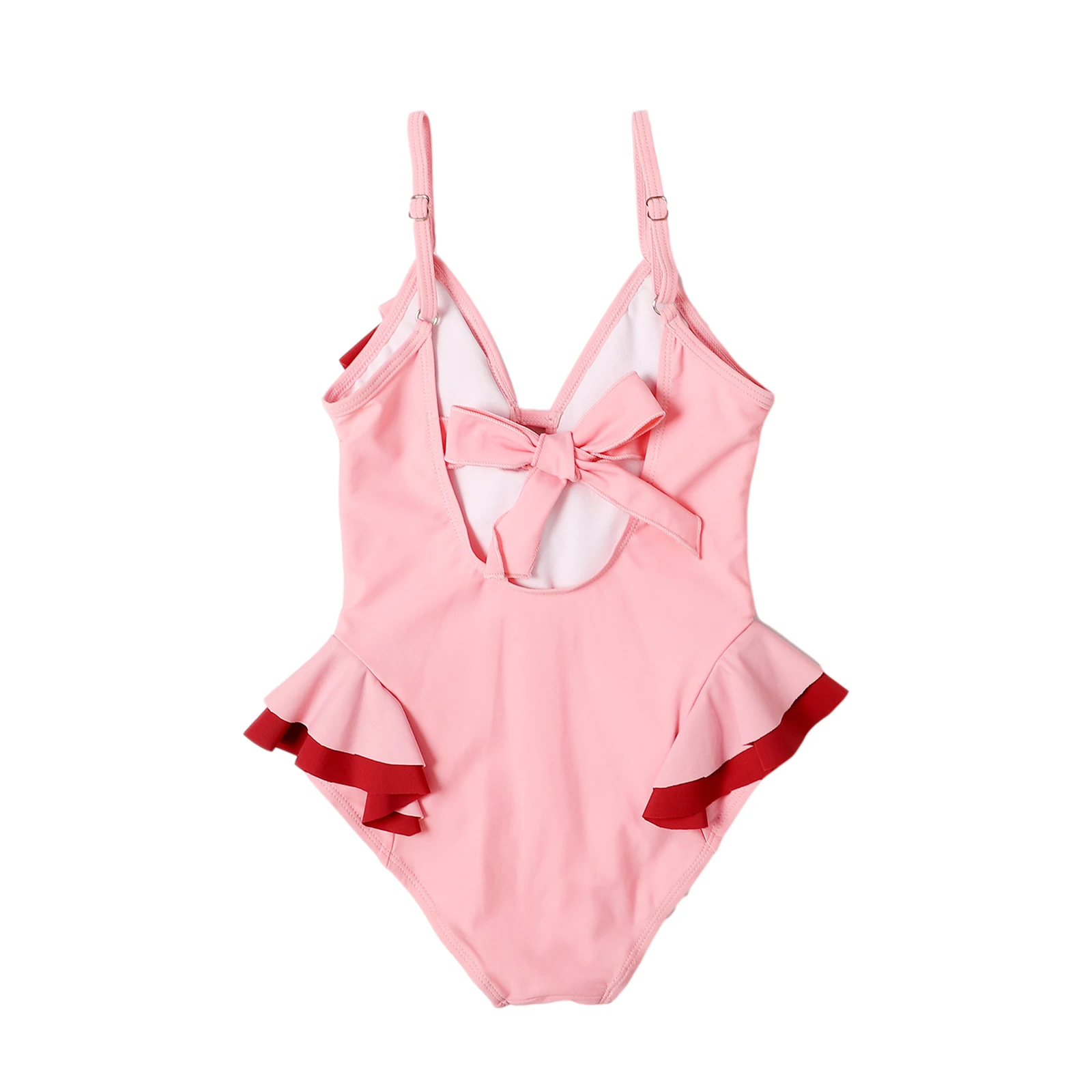 Милый Цельный купальник с оборками контрастного цвета для маленьких девочек-уникальный купальник без рукавов с бантом и открытой спиной, который обеспечивает комфортное положение детей, сохраняя стройность и элегантную форму.