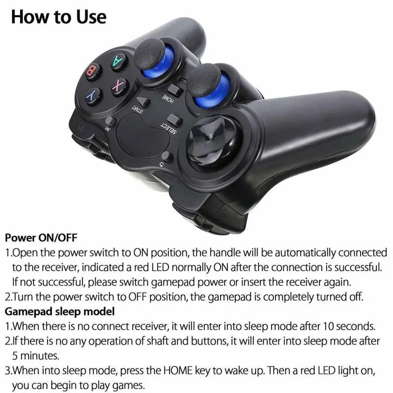 1. Откройте переключатель питания в положение ON, ручка будет автоматически подключена к приемнику, как правило, после успешного подключения указан красный светодиодный индикатор. Если не удалось, пожалуйста, включите питание геймпада или вставьте приемник снова.