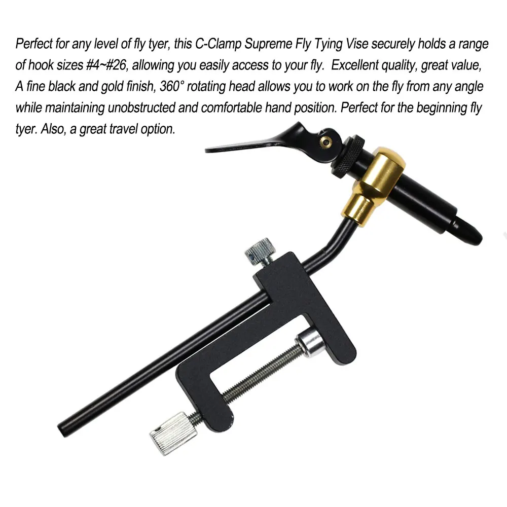 Идеально подходит для любого уровня fly tyer, этот C-Clamp Supreme Fly locking тиски надежно удерживает диапазон размеров крючков #4 ~ #26, что позволяет легко получить доступ к вашей мухе. Отличное качество, отличное соотношение цены и качества, тонкая черная и золотая отделка, вращающаяся на 360 ° головка позволяет работать на лету под любым углом, сохраняя беспрепятственное и удобное положение рук. Идеально подходит для начинающих мушек. Кроме того, отличный вариант для путешествий.