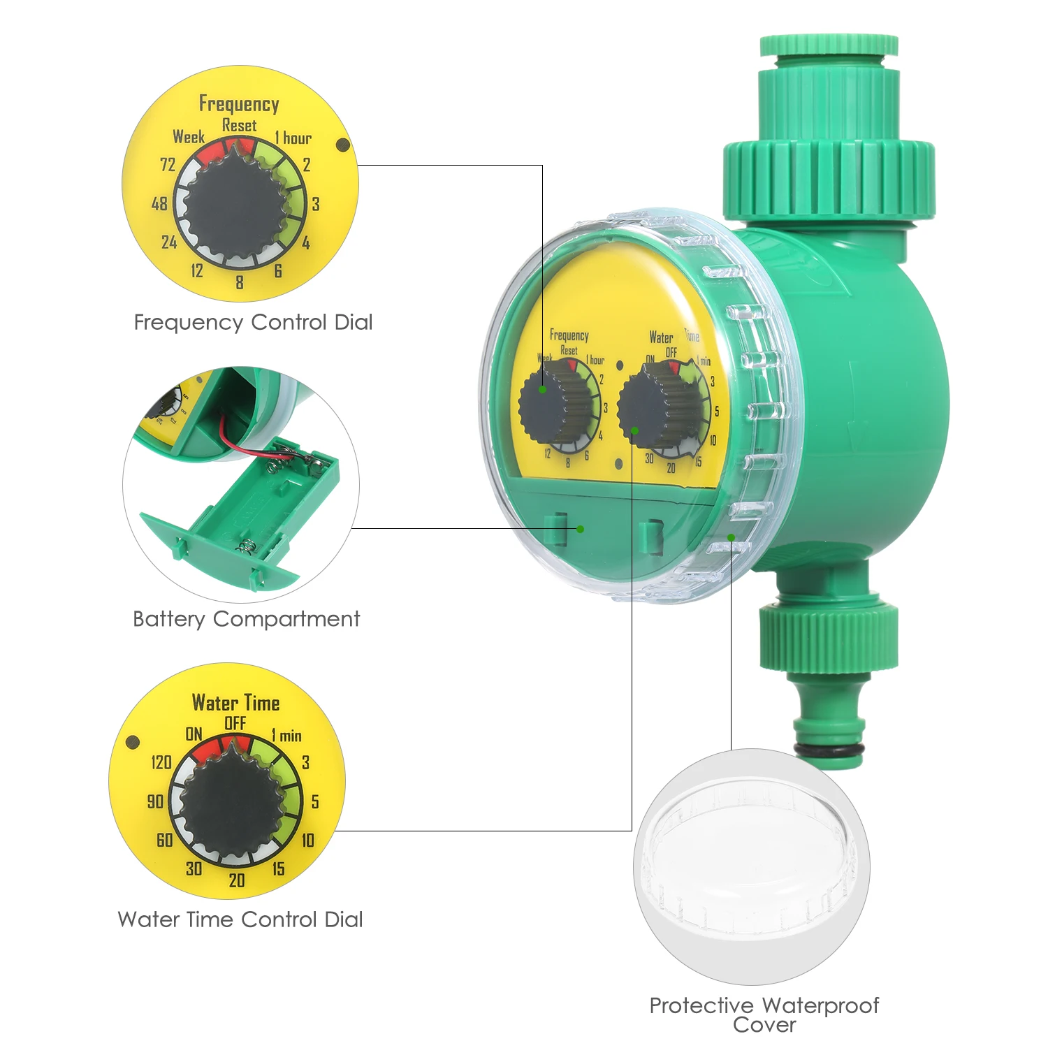 Автоматический контроллер орошения:Прочный таймер орошения, Питание от 2 * батарейки типа "ААА", низкое энергопотребление и длительный срок службы, позволяет широкий диапазон времени работы и интервала-гибкий график полива, настройка с помощью вращающегося циферблата.