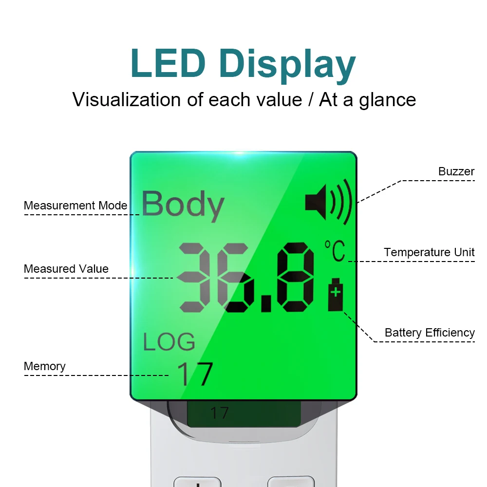 3. Интеллектуальный и гуманизированный дизайн: наш цифровой термометр может хранить и запоминать до 35 температурных показаний, что может помочь вам отслеживать изменения температуры. Через 15 секунд Смарт автоматически выключается. Инфракрасный термометр с температурой, оснащенный функцией предупреждения о лихорадке, поможет вам лучше понять состояние температуры и соответствующие огни и гудки.
