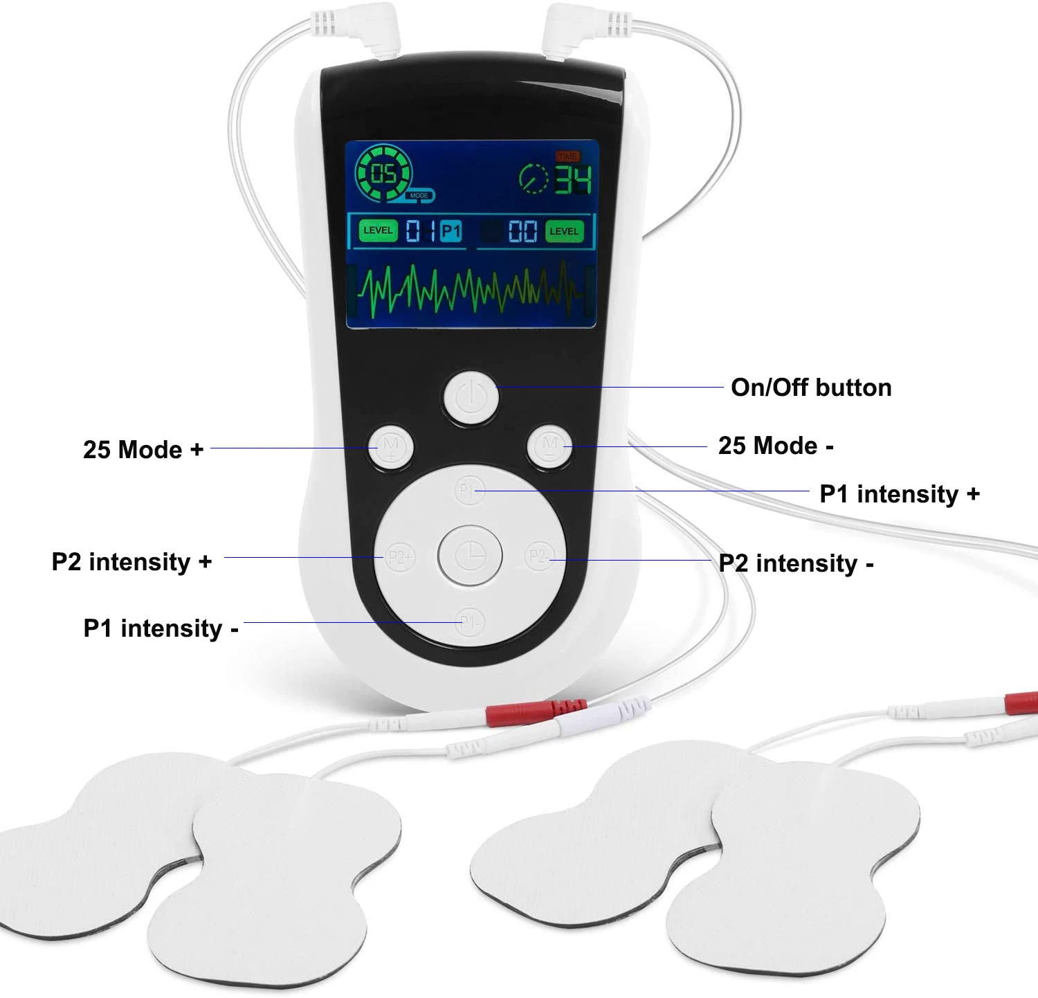 Этот блок TENS имеет 2 канала с 4 электродными прокладками. Интенсивность каждого канала может контролироваться отдельно. Предназначен для использования на двух человек одновременно и нескольких различных областях тела. Независимое управление каналом для левой и правой сторон Используйте одну сторону или оба/обработайте сразу две области вашего тела Обращайтесь к двум людям одновременно! Идеально подходит для отдыха с супругой.
