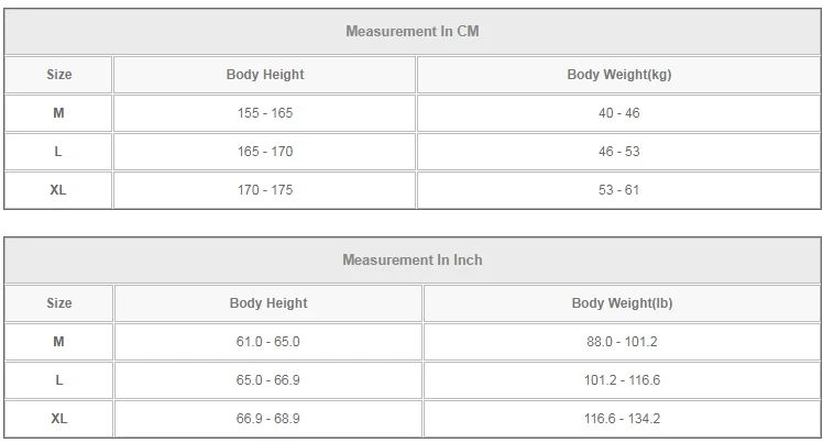 | XL | 170 - 175 | 53 - 61 |