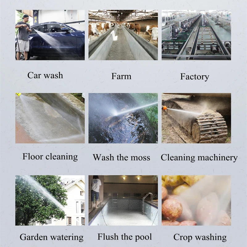 Это многофункциональная автомобильная стиральная машина, которая может быть использована в автомоечных магазинах, фермах, фабриках, очистке земли, мох, большом оборудовании, поливе сада, стирке бассейна, мытье урожая и т. д.