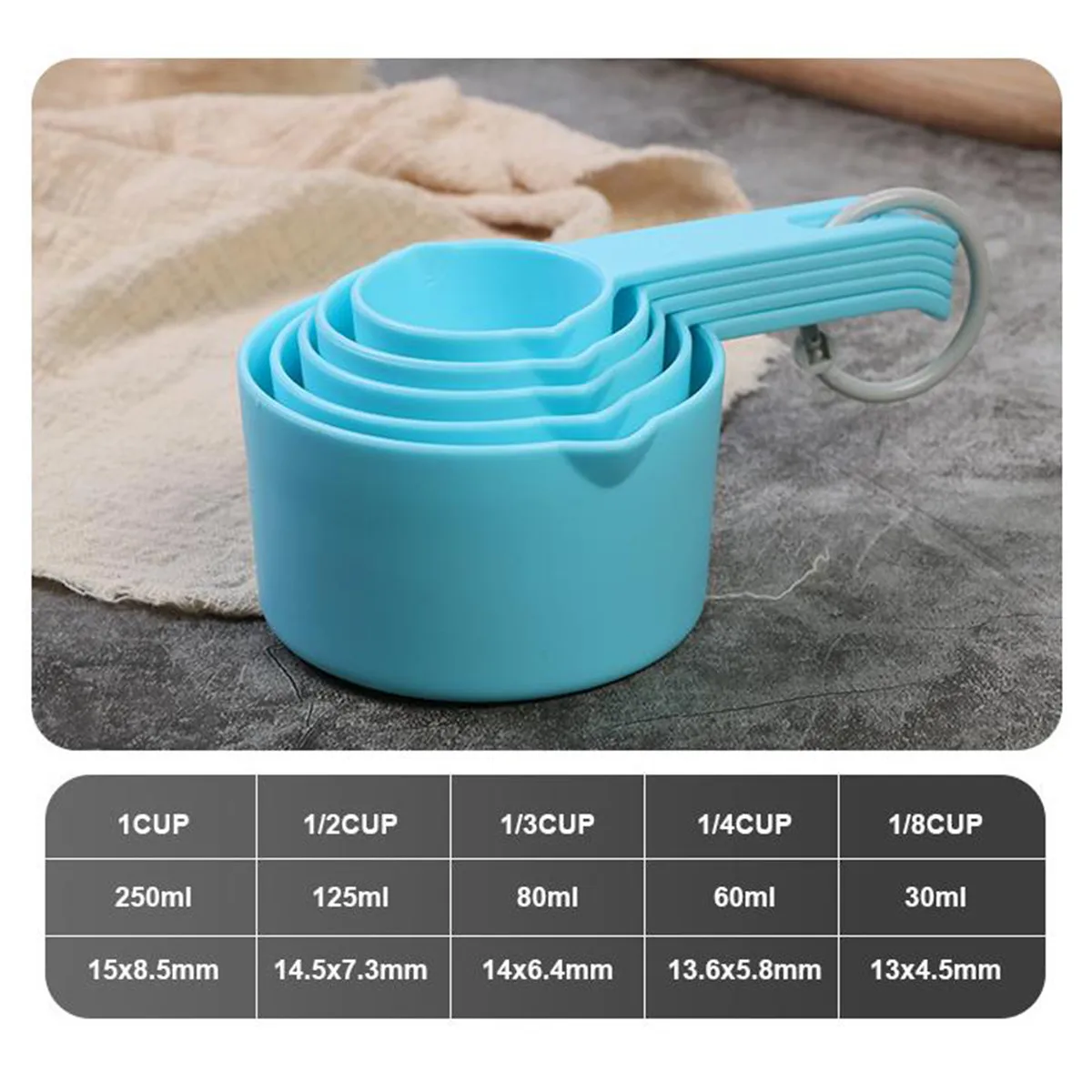Пять мерные ложки соединены с кольцевой пряжкой, которая является съемной и имеет дизайн кольцевой пряжки, что удобно для хранения и подвешивания.