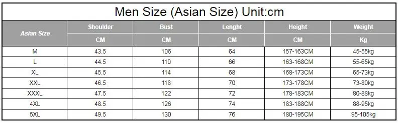 Мужской размер (Азиатский размер) Единица измерения: см | |||||