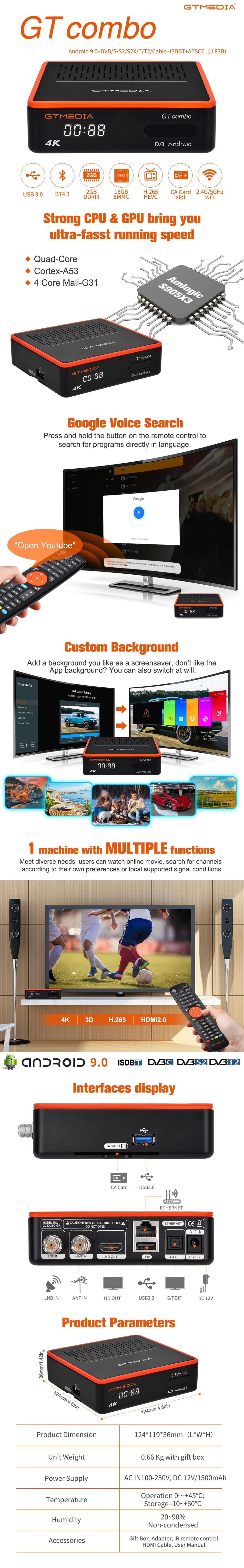 1. Android 9.0 TV BOX + DVB-S/S2/S2X,DVB + T/T2/Cable/ATSC-C(J.83B)/ISDBT, AVS + HEVC main 10 profile(10 бит)2.Amlogic S905X3 2GBRAM + 16GBROM3. Поддержка 4K ультра-высокой четкости дисплея и декодера, двухъядерный процессор MIPS75Kf;4. Поддержка Unicable, DiSEqC1.0/1,1/1,2/USALS мотор полностью поддерживает;5. Поддерживает полный ключ PowerVu, DRE & Biss;6. Встроенный Wifi 2,4G/5G + BT4.1, 802.1.1b/g/n/ac7. Система является GT UI, GTStore Addons предустановленной.Netflix,Youtube,Prime-Video,Disney Plus, онлайн-фильмы и т. Д.Скайп чат, Picasa, мерцание, Facebook8. Поддержка M3U на GTPlayer,9. Поддержка декодирования карт CCAM, NEWCAM, MGCAM и CA;