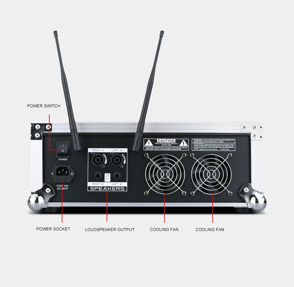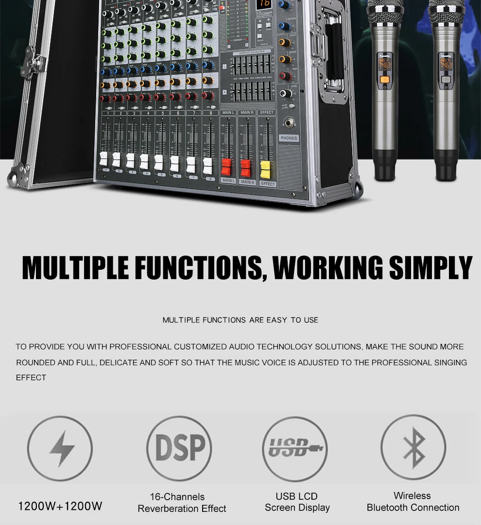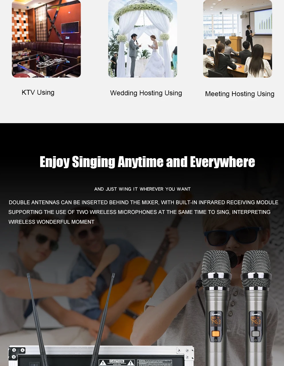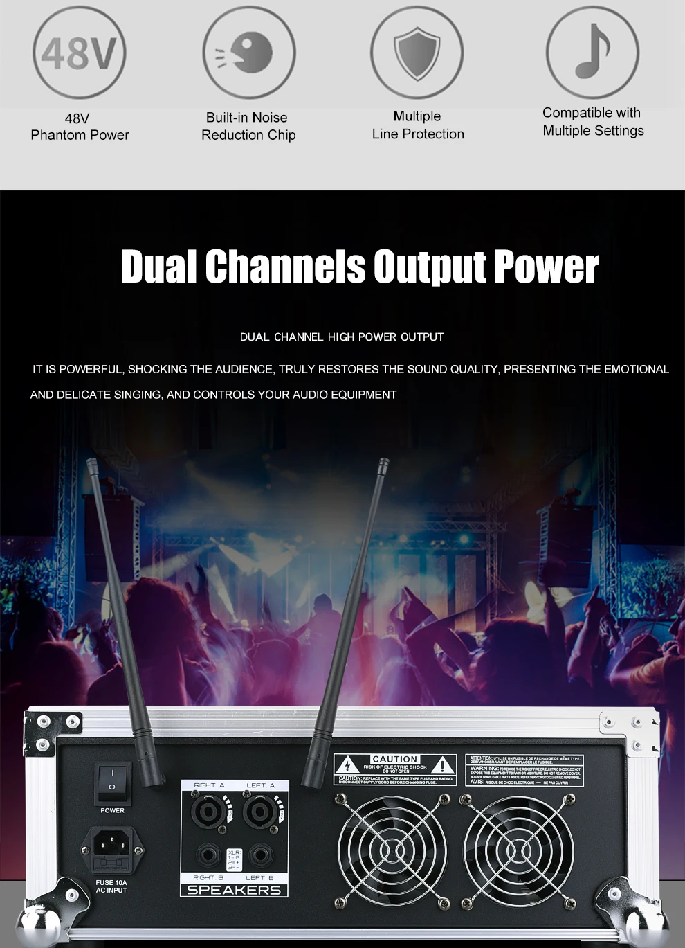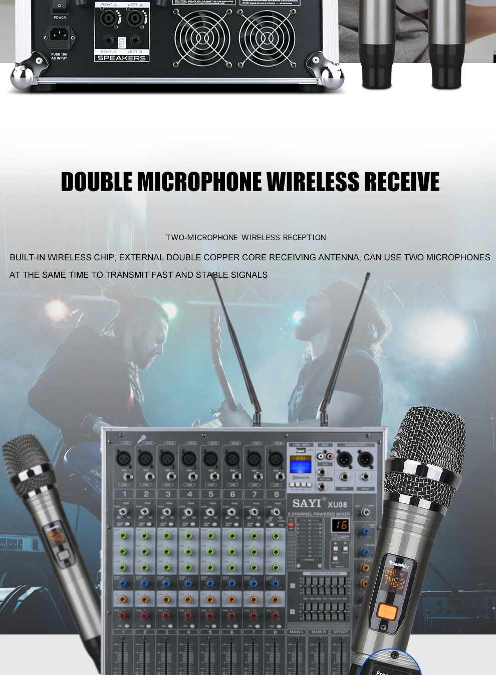 Скажешь XU08 является 8 каналов Интегрированная машина двойного беспроводные микрофоны с звукомикшер и усилитель мощности, который имеет прочный алюминиевый сплав ящик для полетов, 48В, 16 виды реверберации эффекты. Чтобы предоставить вам профессиональные решения по технологии аудио, сделайте звук более округлым и полным, деликатным и мягким, чтобы музыкальный голос был адаптирован к профессиональному эффекту пения. Двойные антенны могут быть вставлены за миксером, со встроенным инфракрасным приемным модулем, Поддержка одновременного использования двух беспроводных микрофонов для пения, интерпретации беспроводных замечательных моментов. Встроенный беспроводной чип, внешняя двойная медная приёмная антенна, может использовать два микрофона одновременно для передачи быстрых и стабильных сигналов. Поддерживает ёмкостный микрофон с источником питания 48 В, пение не ограничено, что делает производительность более замечательной.