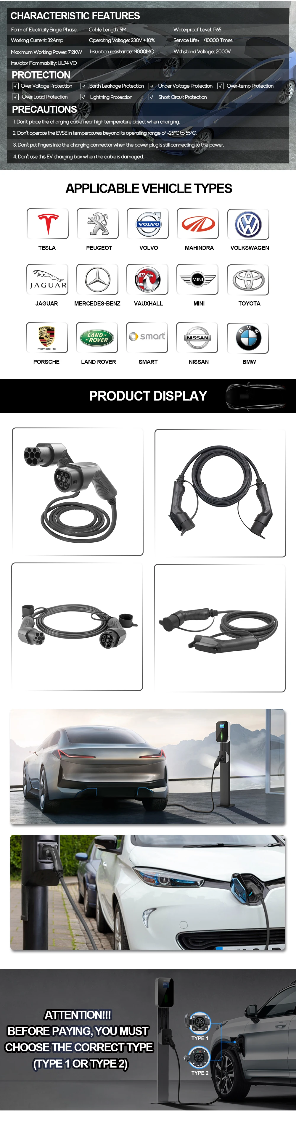 Монитор в режиме реального времени оснащен для обнаружения температуры автомобильного торца и настенных вилок. После обнаружения температуры выше 80 °C ток будет отключен немедленно, когда температура вернется ниже 50 °C, зарядка возобновится.