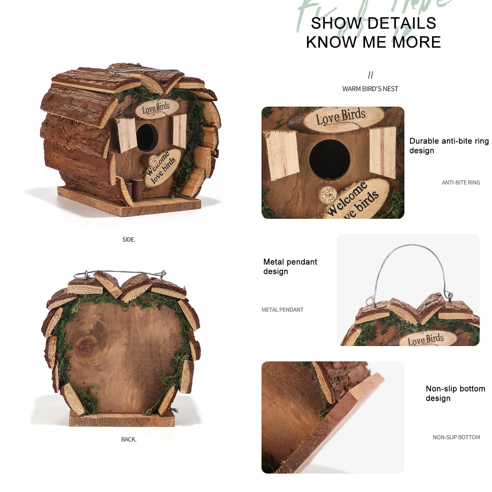 1. 100% натуральные материалы: Висячие птичьи домики изготовлены из натурального дерева, и каждый из них уникален. Прочный и прочный, не легко деформируется. Обеспечивает необходимую вентиляцию и комфорт.