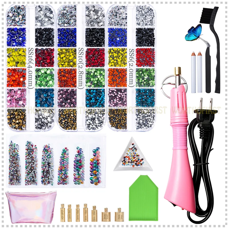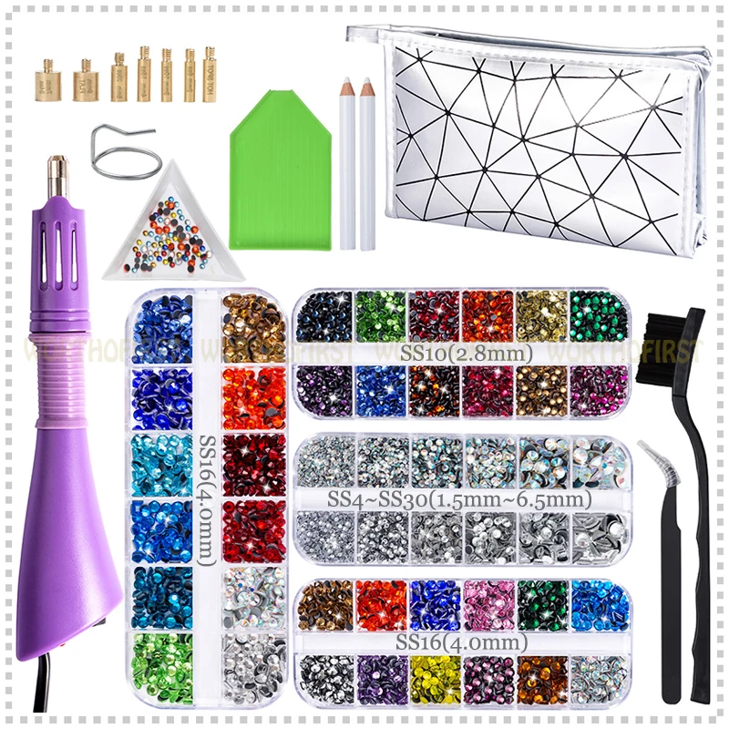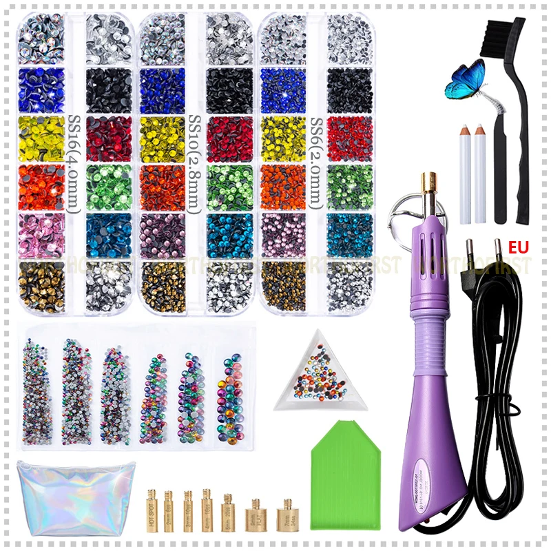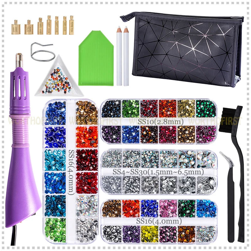 1 аппликатор для исправления (сертифицирован ЕС CE)+ 6 коробок кристалл DMC плоская задняя сторона с термоплавким клеем Стразы около 10000 шт + 14 шт Аксессуары для инструментов + водонепроницаемый мешок для хранения ткани Оксфорд (как показано ниже)
