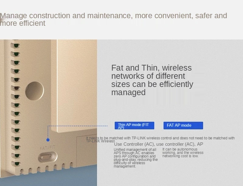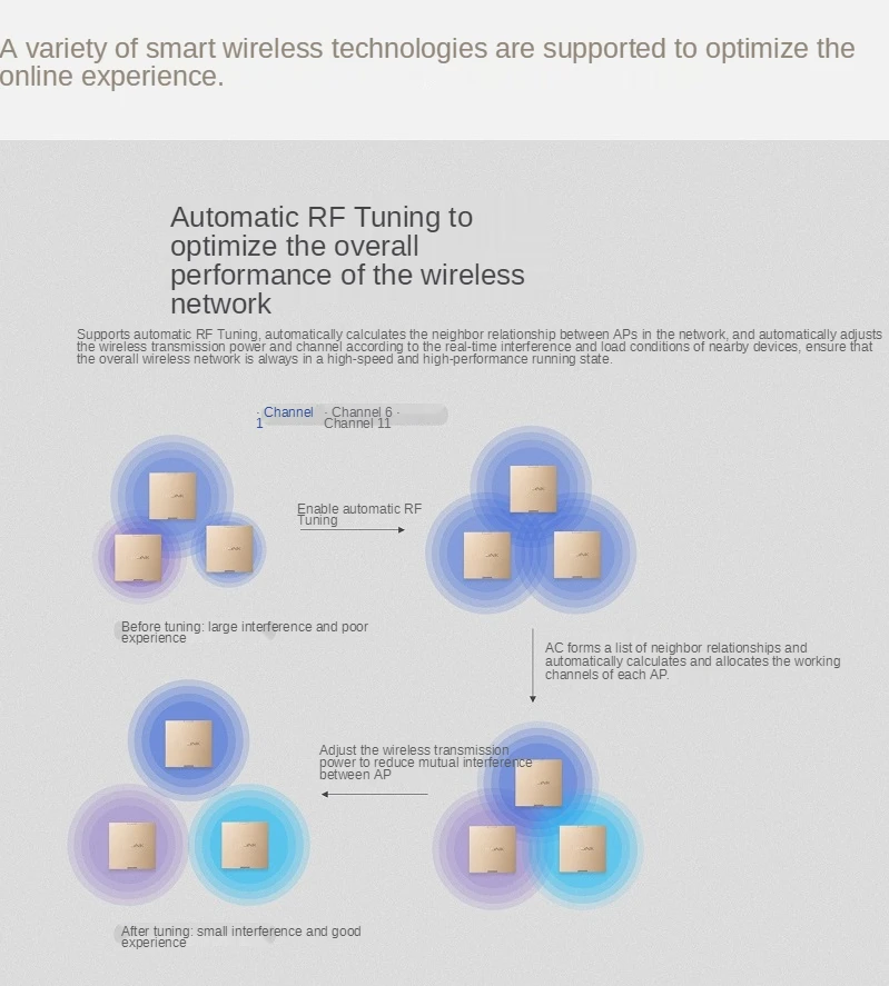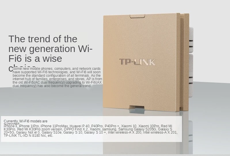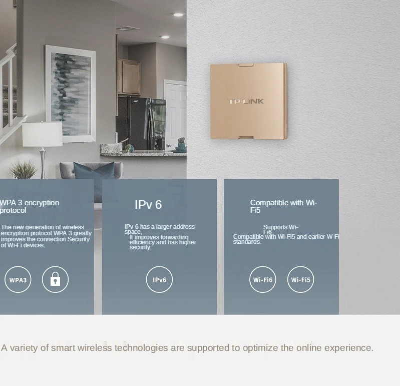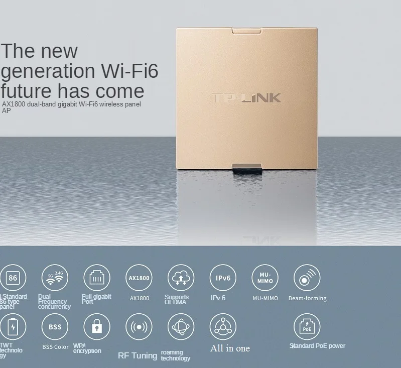 (1) высокопроизводительная беспроводная, обеспечивающая высокоскоростную, стабильную беспроводную сеть 2,4g/5g двухчастотный одновременный ток, 2,4 ГГц диапазон имеет сильную совместимость, дальность передачи, 5G Гц диапазон чистый, меньше помех, двухчастотный одновременный, Скорость беспроводной связи до 1800 Мбит/с. Для удовлетворения потребностей беспроводного Интернета в гостиницах, квартирах, общежитиях, виллах и других интенсивных условиях. Новое поколение технологии Wi Fi 6 (802.11ax) имеет более высокую производительность и лучший опыт. Новый OFDMA, MU-MIMO, TWT и другие беспроводные технологии, производительность продукта сильнее, лучший пользовательский опыт. (2) дизайн панели GB 86, блок питания Poe, прост в установке, прост в использовании Национальный стандарт 86 дизайн панели, может непосредственно заменить оригинальную сетевую панель, без переподключения, не повредить Оригинальное украшение. 802.3AF/at стандартный сетевой кабель питания Poe, без внешнего источника питания, каждому AP нужен только один сетевой кабель, не Ограничиваемый условиями питания, простое AP размещение, Конструкция удобна. (3) Автоматический выбор соответствующего канала, гладкой и стабильной сети В соответствии с окружением AP использования беспроводного канала, автоматически выберите соответствующий канал, избегайте таких же помех частоты, Обеспечивайте беспроводную стабильность. (4) полная и тонкая интеграция, различные размеры беспроводных сетей можно эффективно управлять Режим Fat AP (подходит для беспроводного покрытия небольшой площади): не нужно использовать с беспроводным контроллером TP-LINK (AC), AP может работать независимо, и стоимость Беспроводная сеть низкая; Тонкий режим AP (fit AP) (подходит для беспроводного покрытия большой площади): он должен использоваться с беспроводным контроллером TP-LINK (AC), который может Управление всеми APS равномерно и уменьшение сложности беспроводного управления. Толстый и тонкий в одном, вы можете выбрать различные режимы в соответствии с различными применениями Среды. Поддержка устранения слабых сигналов и запрещение Функции доступа к слабому сигнальному оборудованию. (5) Автоматическая RF Настройка для оптимизации общей производительности беспроводной сети Он поддерживает автоматическую настройку RF, автоматически вычисляет связь между AP в сети и автоматически регулирует беспроводную передачу Питание и канал в соответствии с помехами в реальном времени и нагрузкой окружающих устройств, чтобы гарантировать, что вся беспроводная сеть всегда в высокой скорости и Высокопроизводительное рабочее состояние. (6) Поддержка интеллектуального роуминга и улучшение работы терминала Интеллектуальная технология роуминга на основе протокола 802.11kv используется, чтобы помочь мобильный телефон, pad, компьютер и другие терминальные устройства автоматически получить доступ к AP С лучшим качеством сигнала в различных сценариях AP, таких как отель, квартира, общежитие и вилла, чтобы эффективно улучшить пользовательский опыт и в целом Производительность беспроводной сети.