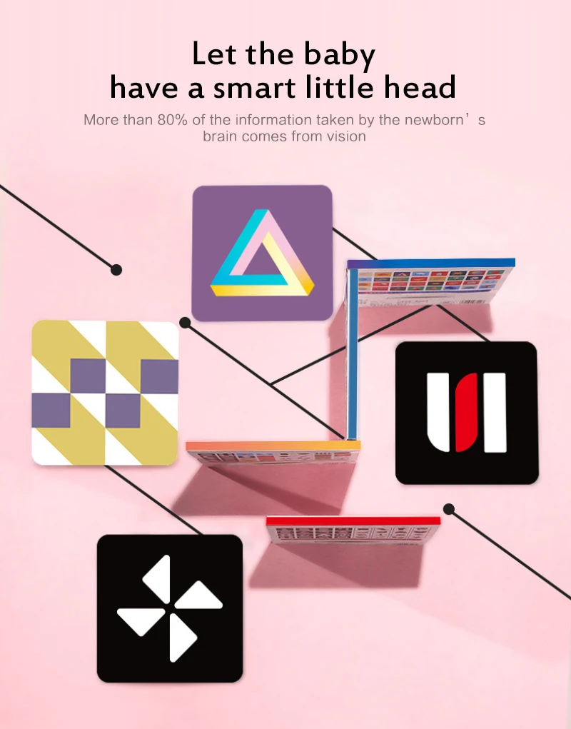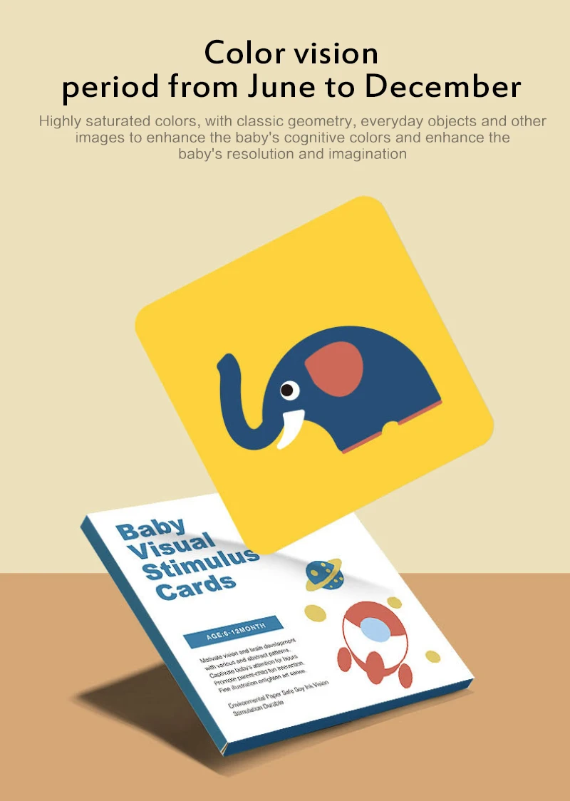 Двухсторонние и большие карты изготовлены из плотного картона и представляют контрастные иллюстрации, основанные на видении ребенка.