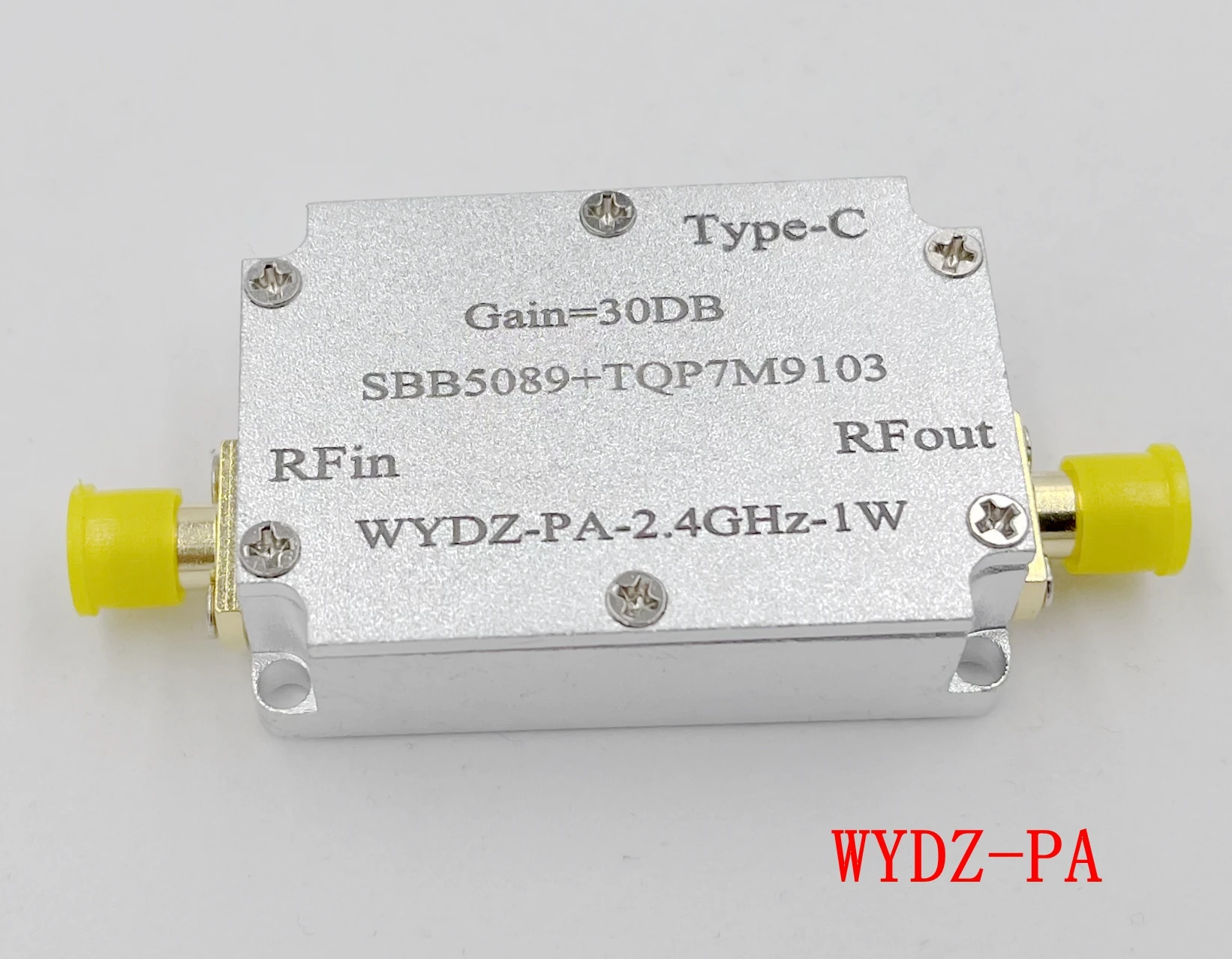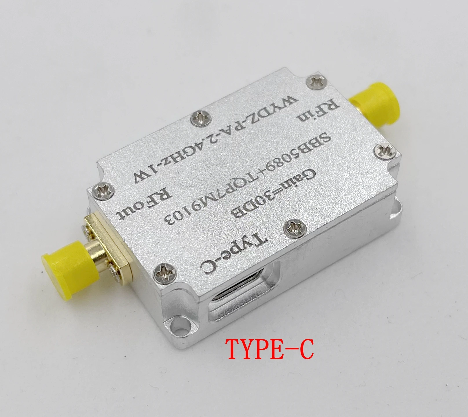 SBB5089 + TQP7M9013-2.4G-1W усилитель мощности 1. Варианты Применения: 1. 2,4G передача видео, jammer 2. Запуск WIFI, запуск Bluetooth, запуск модуля передачи данных 3. Система запуска электромагнитной совместимости 4. Радиопередатчик программного обеспечения 2. Параметры индекса 1. Источник питания: TYPE-C линия; (если вам нужно перейти к линии, свяжитесь с продавцом) 2. Модуль диапазон частот: 2,4 ГГц (узкополосная усилитель мощности); 3. Усиление: 30 дБ (см. Измеренную кривую для разных частот); 4. Объем: 4,5*3*1,4 см (без торчащих SMA), Вес: 66 г (включая хост + TYPE-C кабель); 5. Ток: 1A; (рекомендуется адаптер питания 5 В/1 а) 6. P1dB = 30dBm@2.4GHz (1 Вт); 7. Выходной интерфейс: SMA female, входное и Выходное сопротивление: 50 Ом 8. Список поставки: хост с корпусом из алюминиевого сплава * 1 + линия TYPE-C * 1 3. Измеренная кривая параметров S