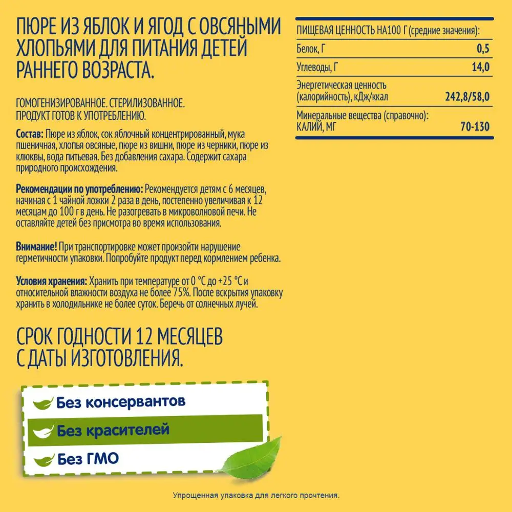 Пюре из яблок, сок яблочный концентрированный, хлопья овсяные, пюре из вишни, пюре из черники, пюре из клюквы, вода питьевая