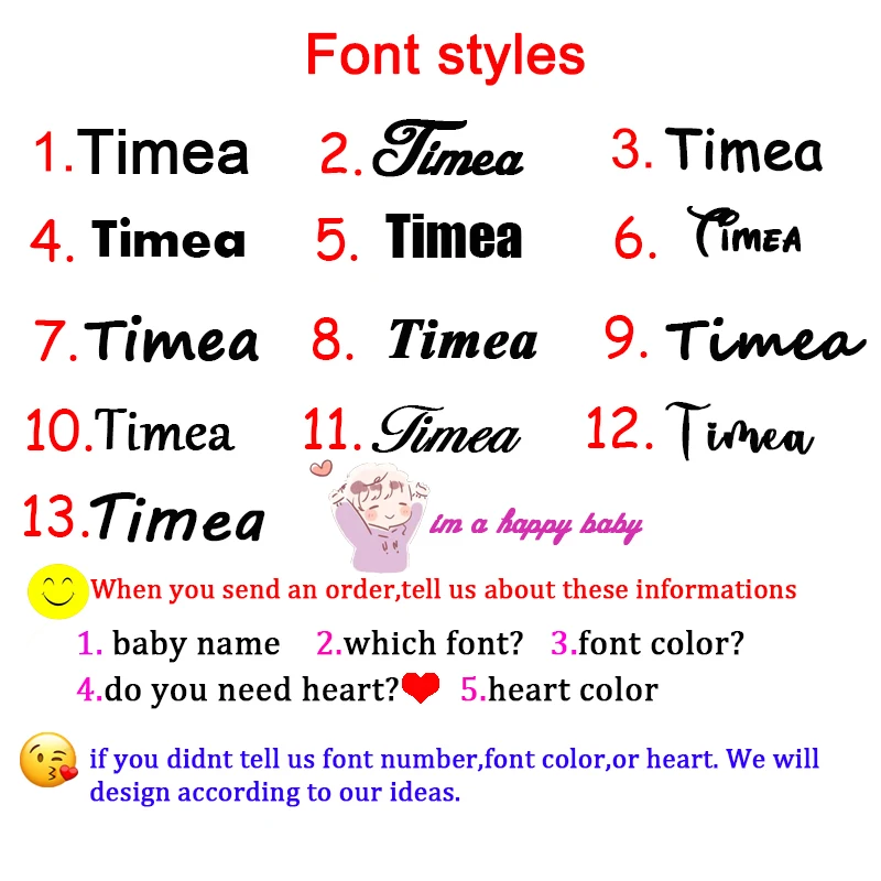 1. Имя ребенка 2. Какой шрифт 3. Цвет шрифта (любые цвета) 4. Вам нужно сердце? 5. Цвет сердца