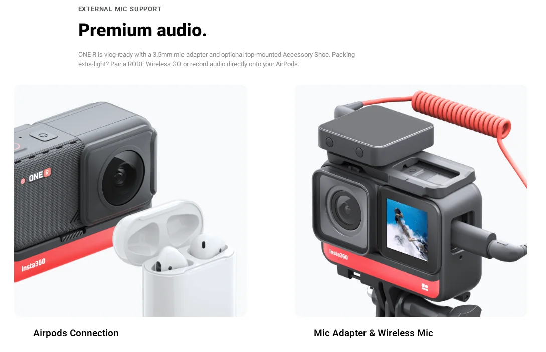 ONE R is vlog-ready with a 3.5mm mic adapter and optional top-mounted Accessory Shoe. Packing extra-light? Pair a RODE Wireless GO or record audio directly onto your AirPods.