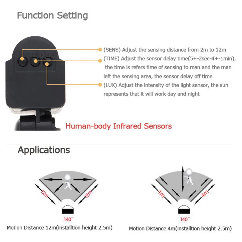 -Длительный срок службы и стабильная производительностьЧувство: Отрегулируйте чувствительность датчика PIR.