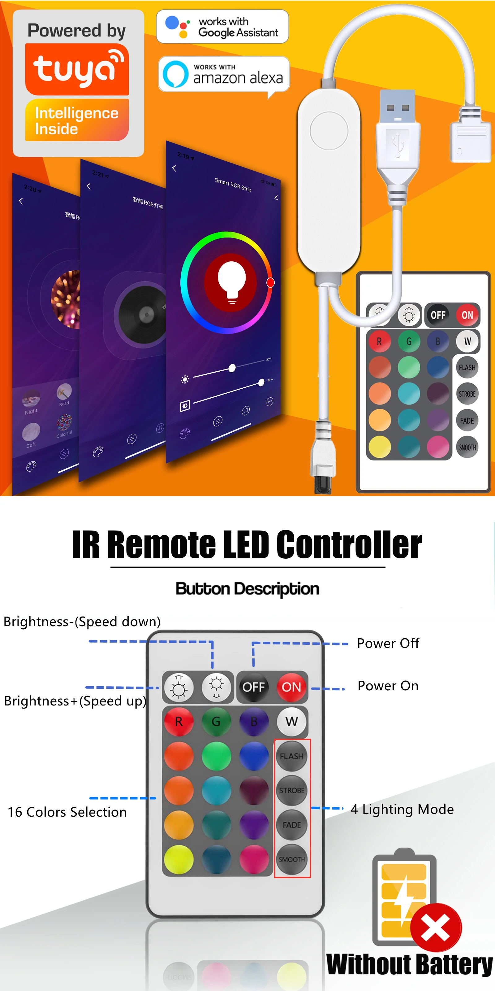 Метод управления: пульт дистанционного управления с приложением/пульт дистанционного управления с 24 кнопками (батарея не входит в комплект)/кнопочное управление