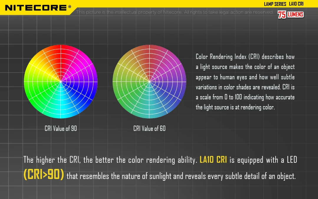 • LA10 CRI: использует Nichia 219B светодиодный, CRI≥ 90