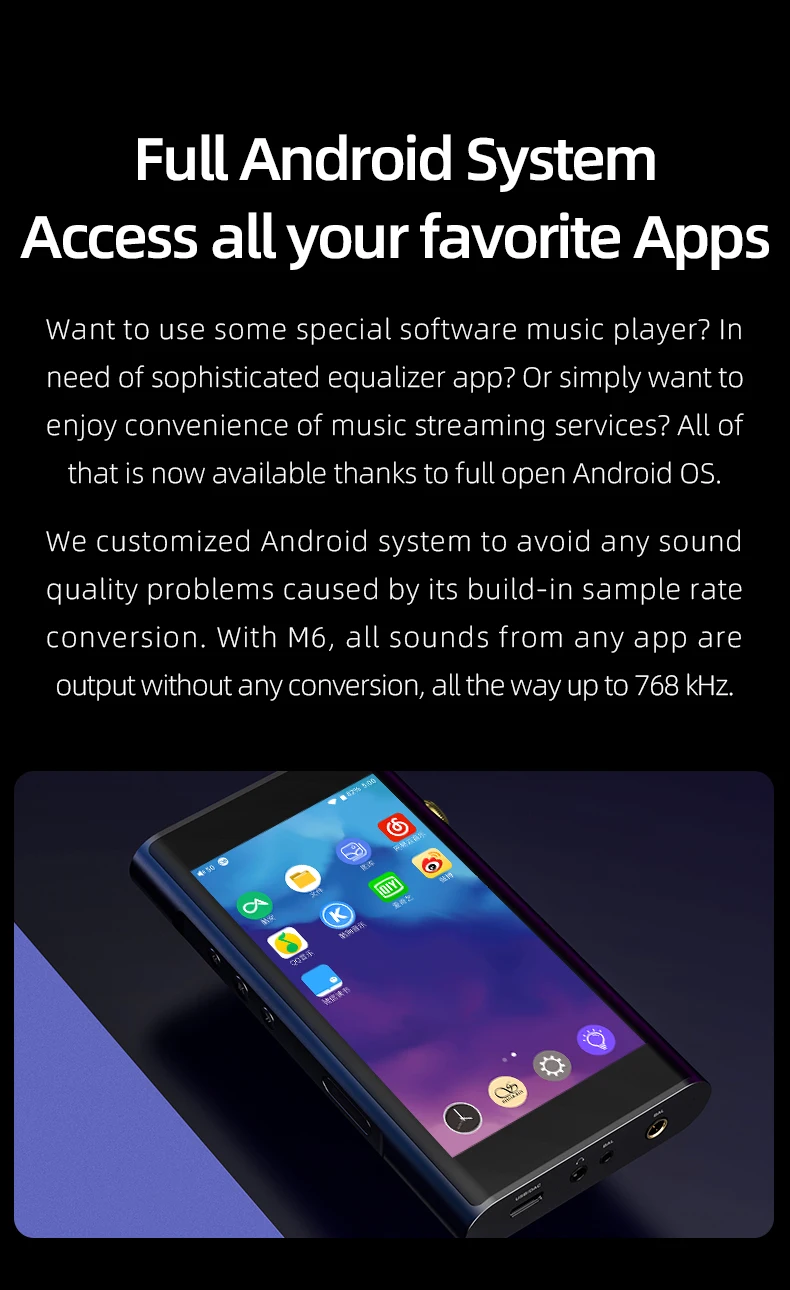 Хотите использовать специальный музыкальный проигрыватель? Нужно сложное приложение эквалайзера? Или просто хотите насладиться удобством потоковой передачи музыки? Все это теперь доступно благодаря полной открытости ОС Android. Мы настроили систему Android, чтобы избежать каких-либо проблем с качеством звука, вызванных его преобразованием в образец. С M6 все звуки из любого приложения выводятся без конвертации, вплоть до 768 кГц.