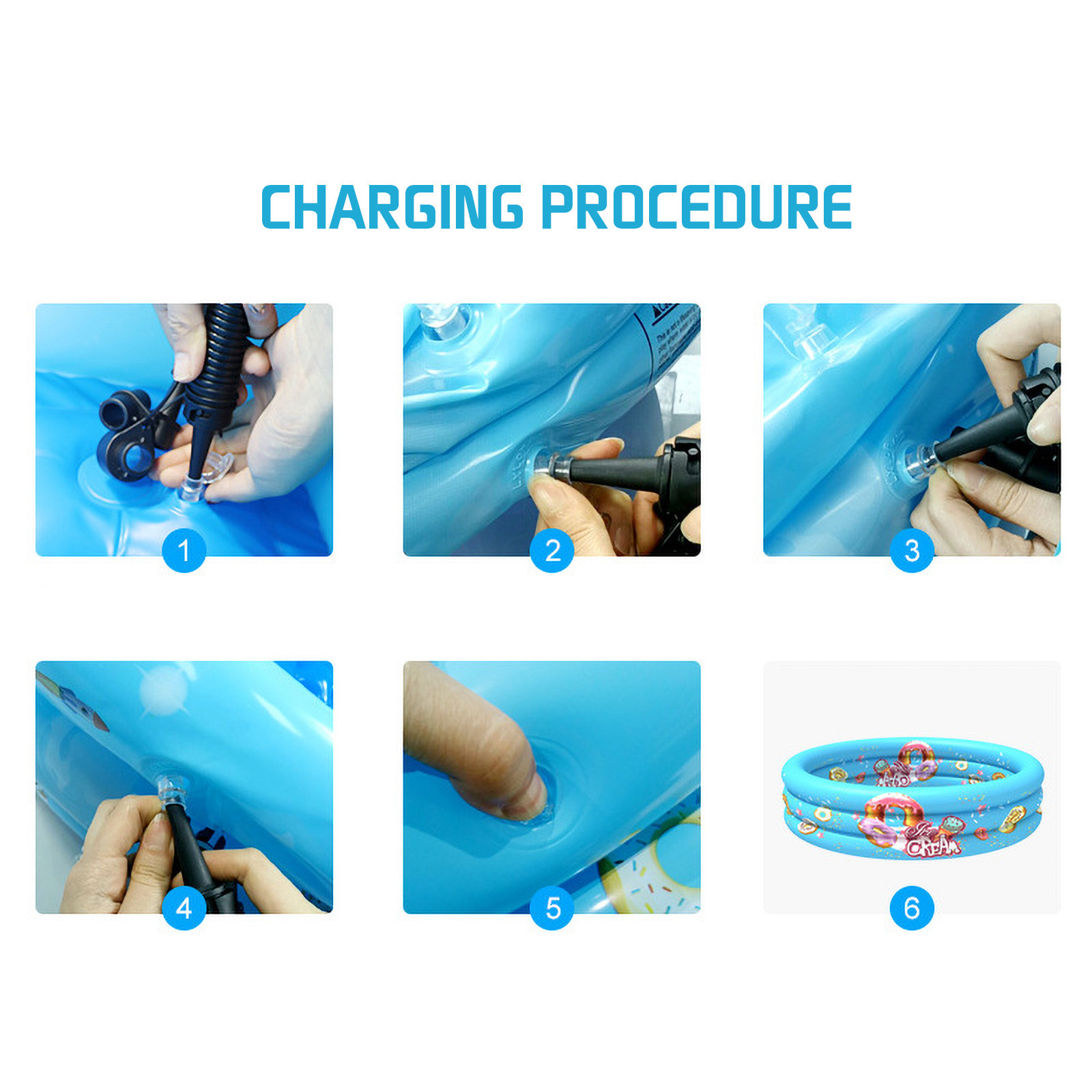 - 2. Сначала откройте инфляционный порт в нижней части бассейна, чтобы надуть, пока он не будет полунасыщенным, а затем надуйте три слоя воздушных камер снизу вверх. После заполнения одного слоя закройте инфляционный порт плотно, чтобы предотвратить утечку воздуха;