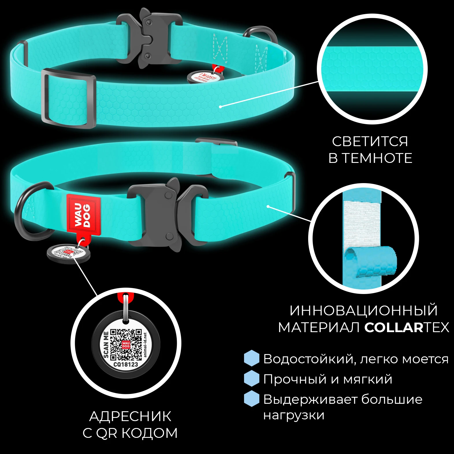 Ошейники серии Waterproof представлены в 7-ми ярких цветах, один из которых (ментоловый) светится в темноте!