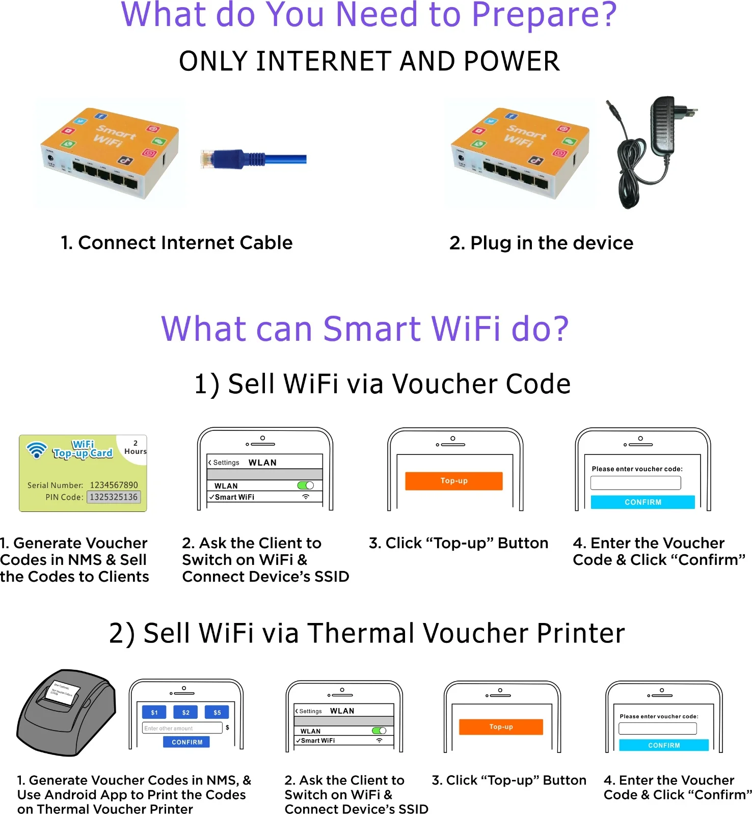 Умный WiFiЭто Wi-Fi роутер для зарабатывания денег. Он предоставляет посетителям мгновенный WiFi Интернет-сервис в общественных местах. И владелец может получить доход, продавая услугу Wi-Fi (на основе данных времени или трафика) через это устройство с помощью ваучерных кодов.