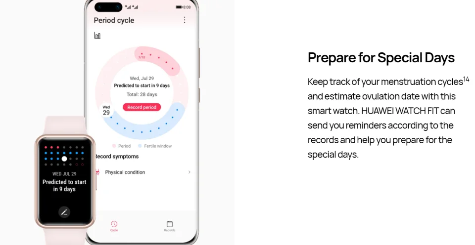 Отслеживайте свои менструальные циклы 14 и оцените дату овуляции с помощью этого смарт-часа. HUAWEI WATCH FIT может отправлять вам напоминания в соответствии с записями и помогать вам подготовиться к особым дням.